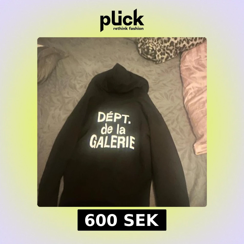 Säljer en svart hoodie med texten 'DÉPT. de la GALERIE' på framsidan. Hoodien har dragkedja och är perfekt för en avslappnad stil. Den är designad av Josue Thomas och har en klassisk passform.
