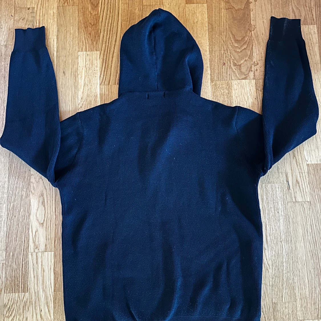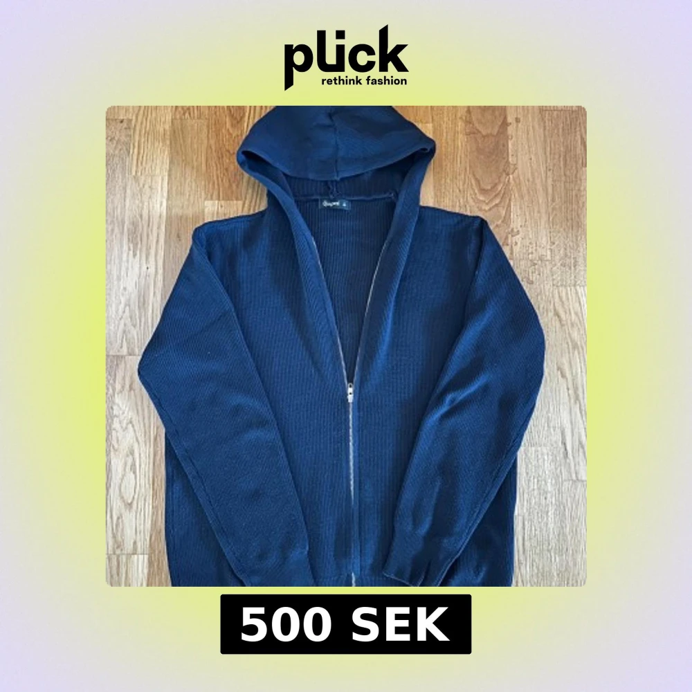 Mörkblå hoodie med dragkedja från Qingwai. Tröjan är ribbstickad, har huva och långa ärmar. Perfekt för kyliga dagar och enkel att matcha med jeans eller joggers.