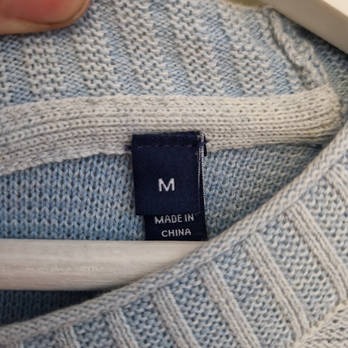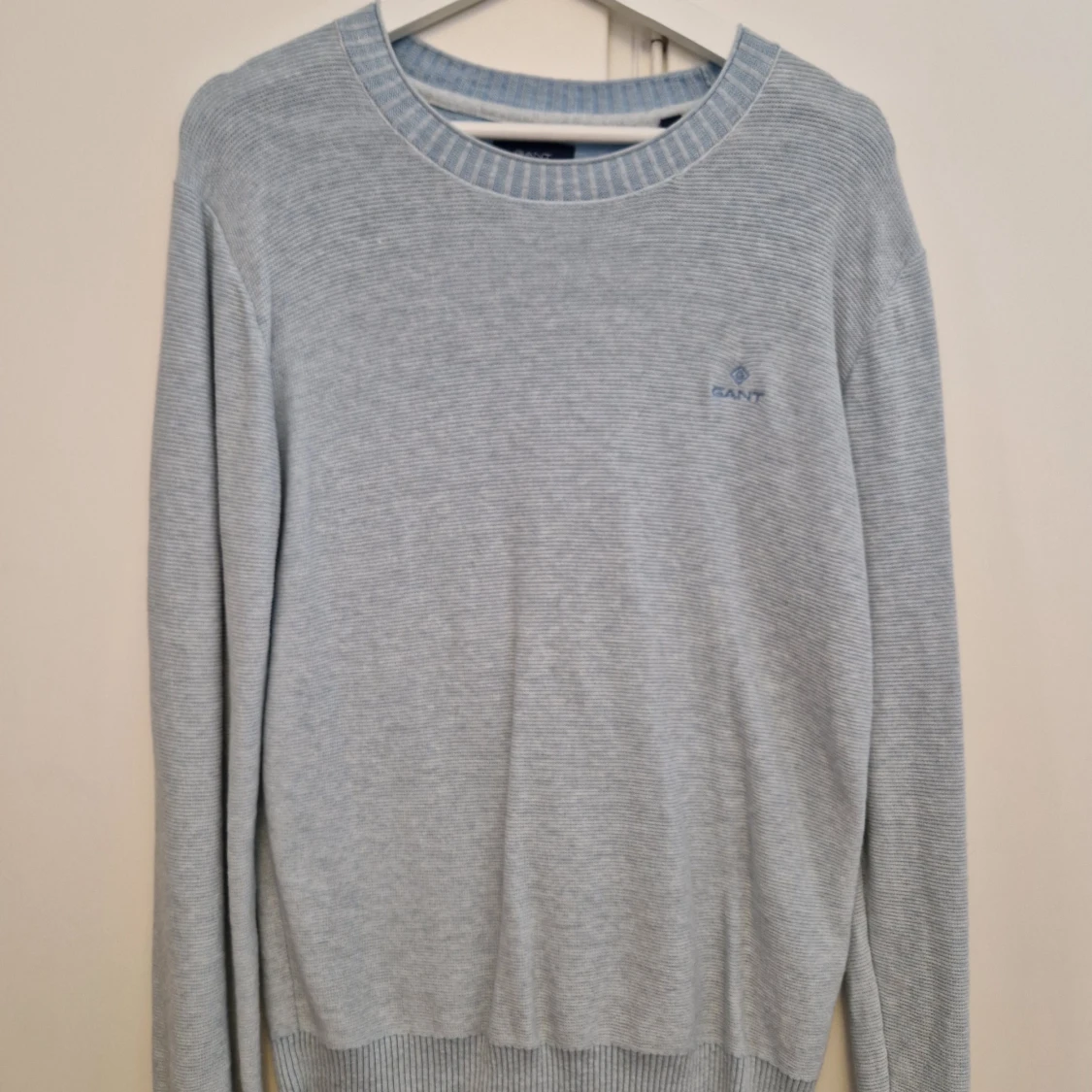 Stickad Gant tröja i ljusblå storlek M. Bara använd en gång. Färgen på den här är riktigt snygg och den är i nyskick, så buda på bara!