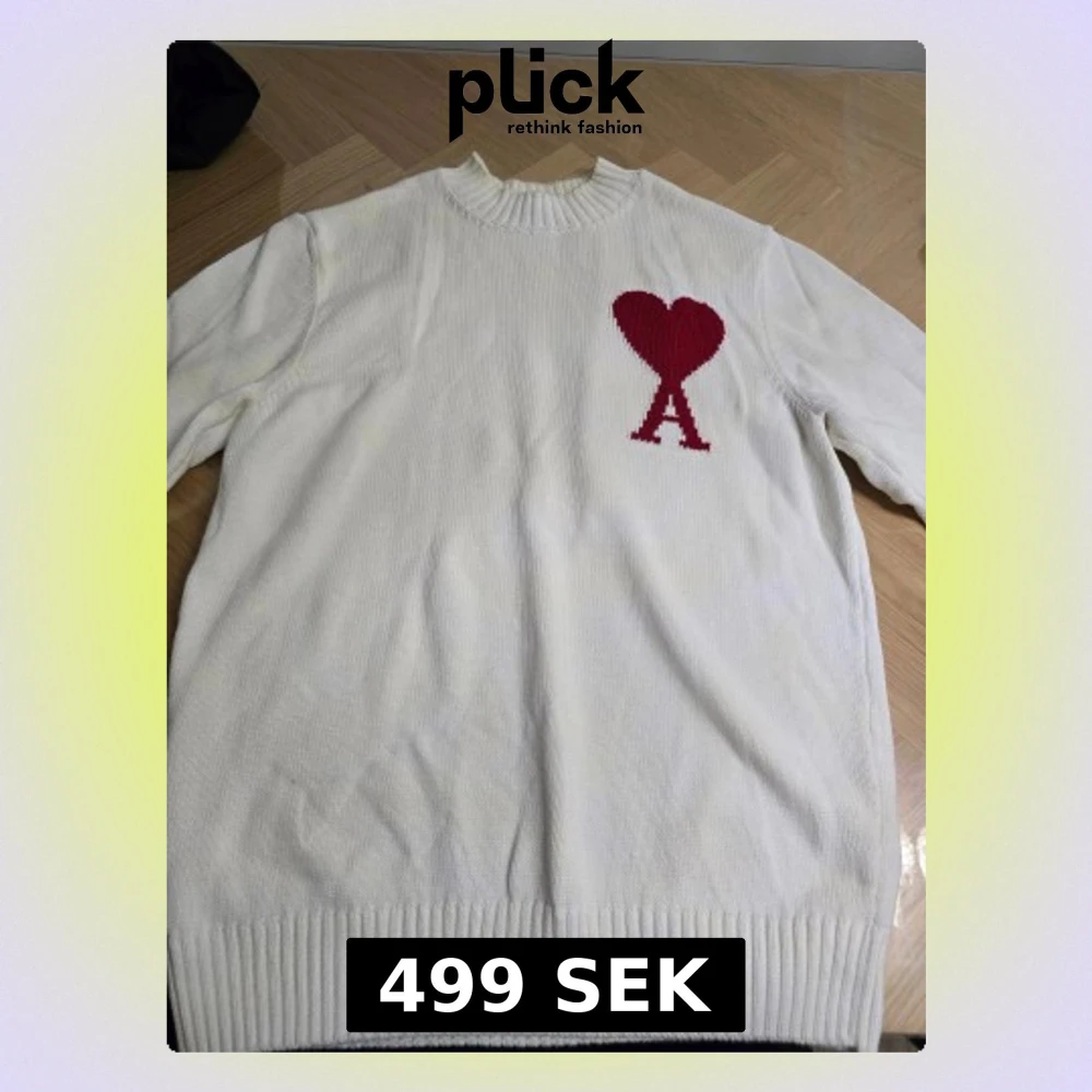 Säljer en vit fin stickad tröja från Ami Paris i storlek L. Passar strl M också. QR-scan medföljer🚀