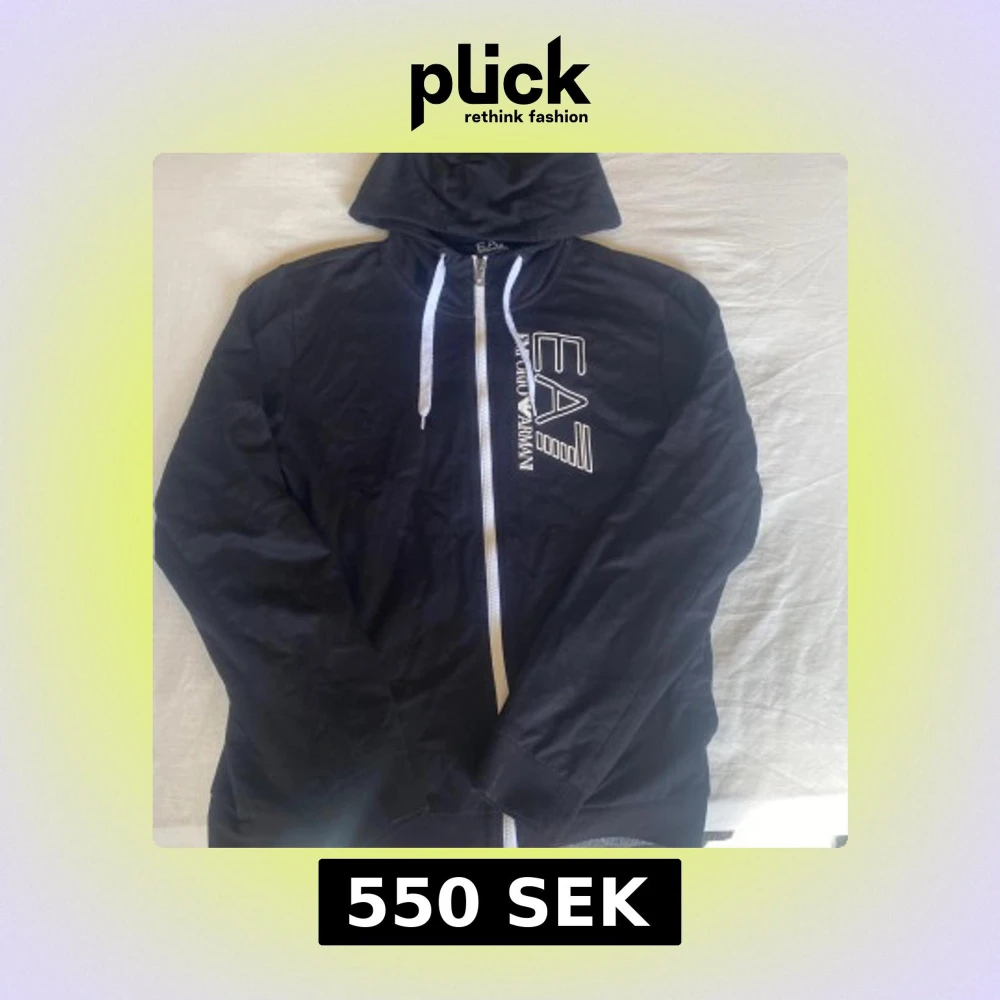 Svart hoodie från Emporio Armani med vit dragkedja och vita snören i huvan. Stort EA7-tryck i vitt på bröstet ger en cool look. Tröjan har långa ärmar och är tillverkad i mjuk bomull, perfekt för chill dagar. Snygg och enkel att matcha med jeans eller joggers.