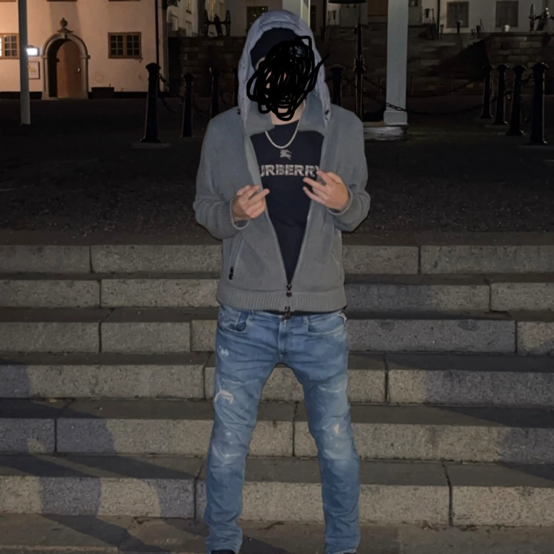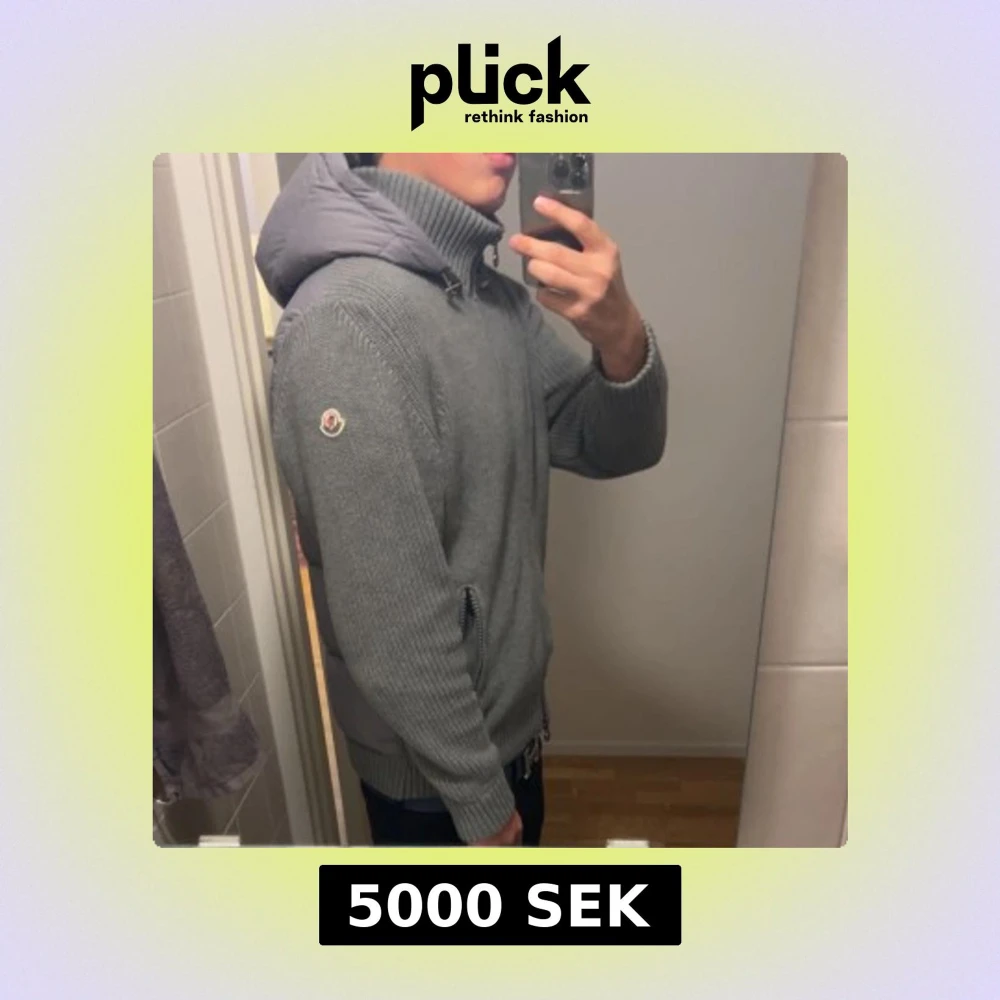 Säljer en grå cardigan från Moncler med stickade ärmar och kropp i dun. Jackan har stor huva, dragkedja framtill och Moncler-logga på ärmen. Perfekt för kalla dagar och riktigt snygg till streetwear-stilen.