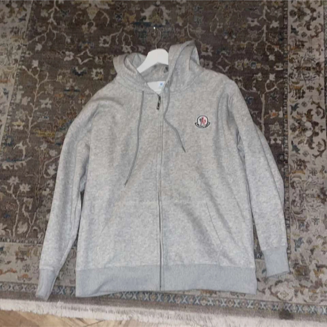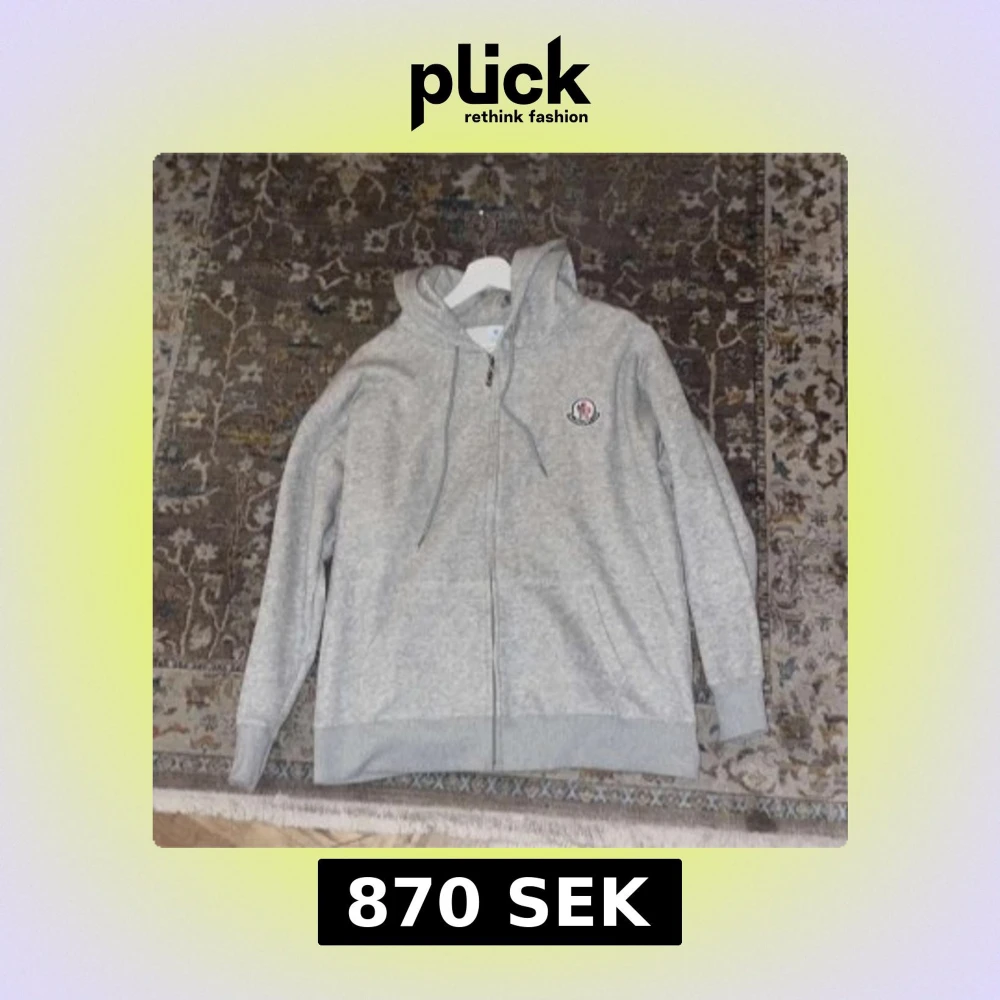 Snygg grå hoodie från Moncler med dragkedja framtill och huva med snörning. Klassisk logga på bröstet och ribbade muddar vid ärmslut och nederkant. Perfekt för en chill och stilren look.