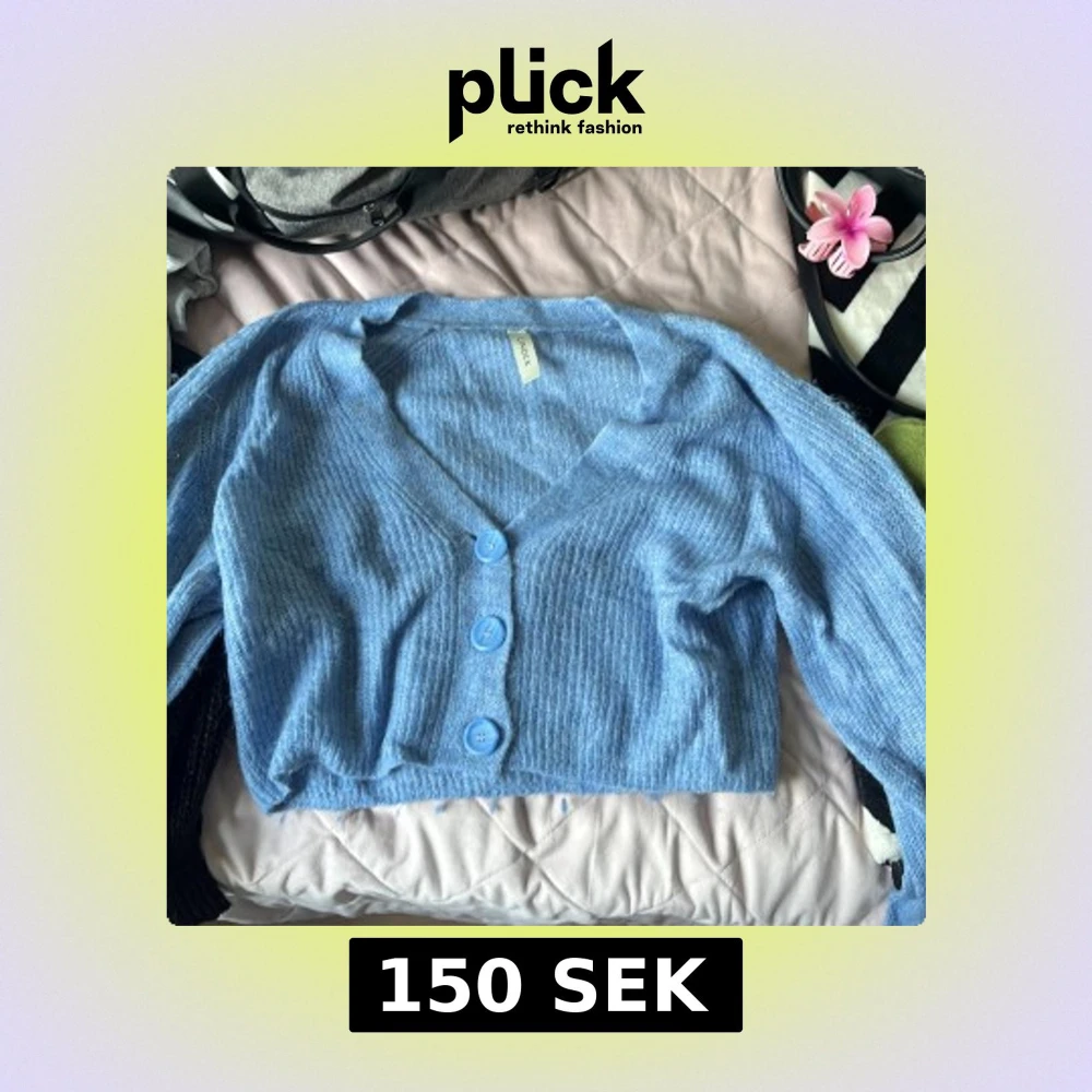 Superfin ljusblå kofta från Lindex med ribbad struktur och tre stora knappar framtill. Koftan är croppad och har v-ringad hals samt långa ärmar. Perfekt att slänga över en topp för en chill look.
