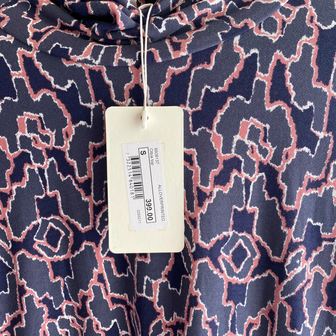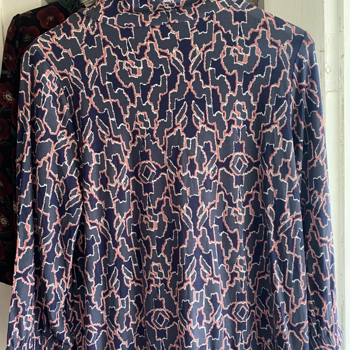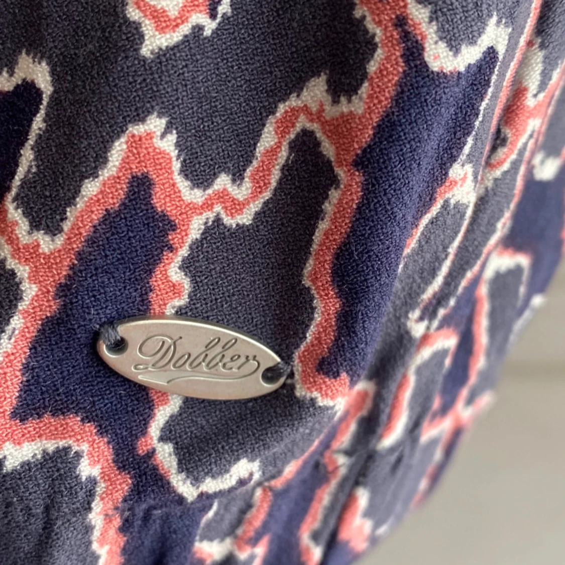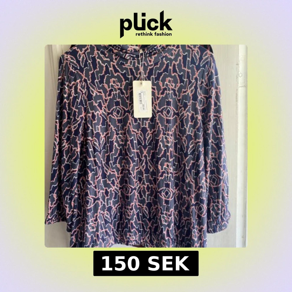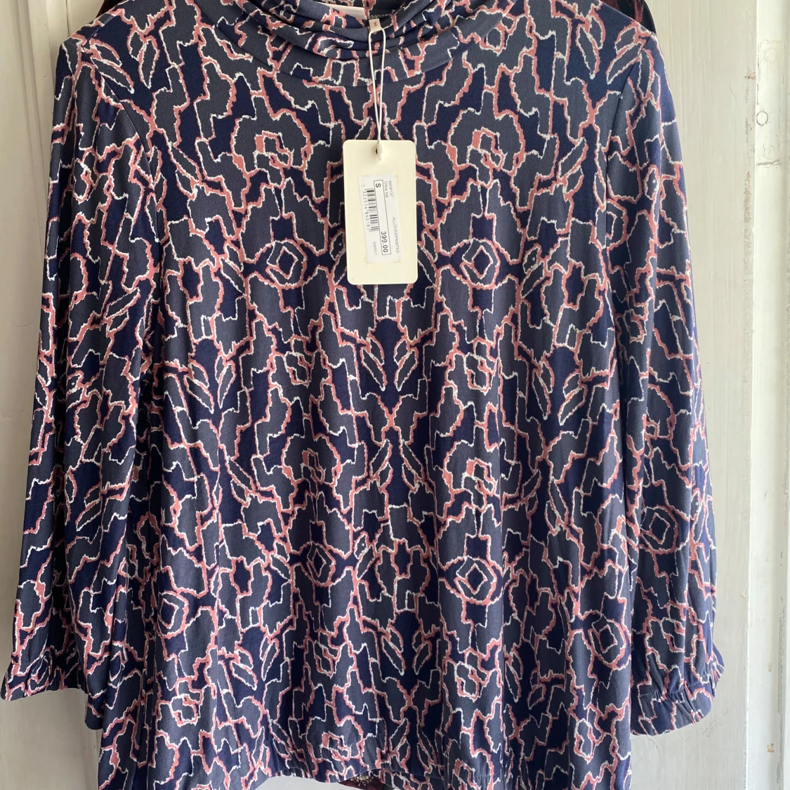 Säljer en cool långärmad tröja från Dobber med abstrakt mönster i marinblått, rosa och vitt. Tröjan har en lös passform och en mjuk, lite högre krage. Perfekt för dig som gillar unika prints och vill sticka ut lite extra.