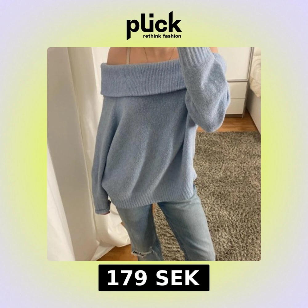 Säljer en mysig ljusblå offshoulder tröja med långa ärmar från H&M.
