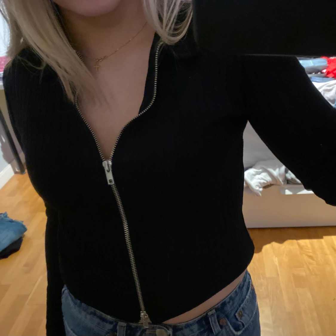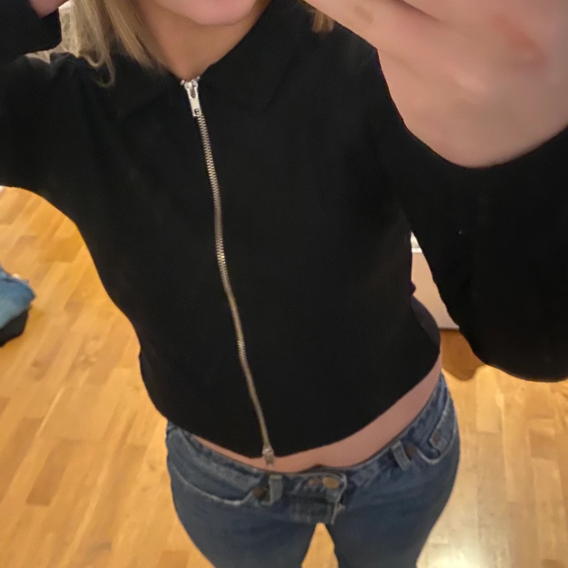 Snygg svart långärmad ribbad tröja med dragkedja! Den går både att dra upp och dra ned. Storlek S