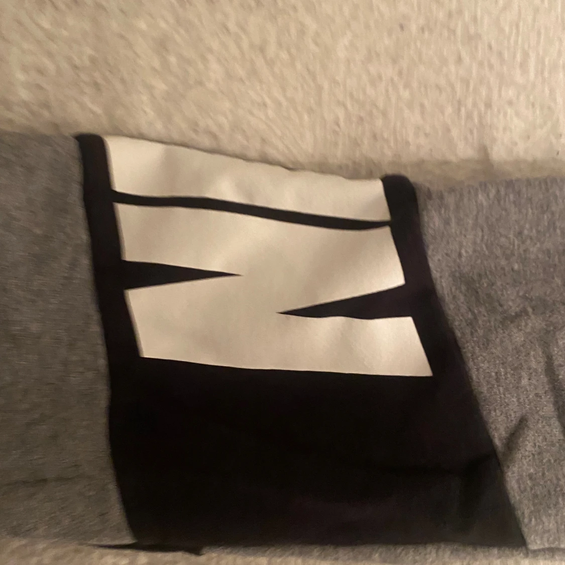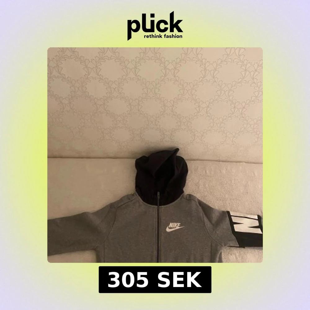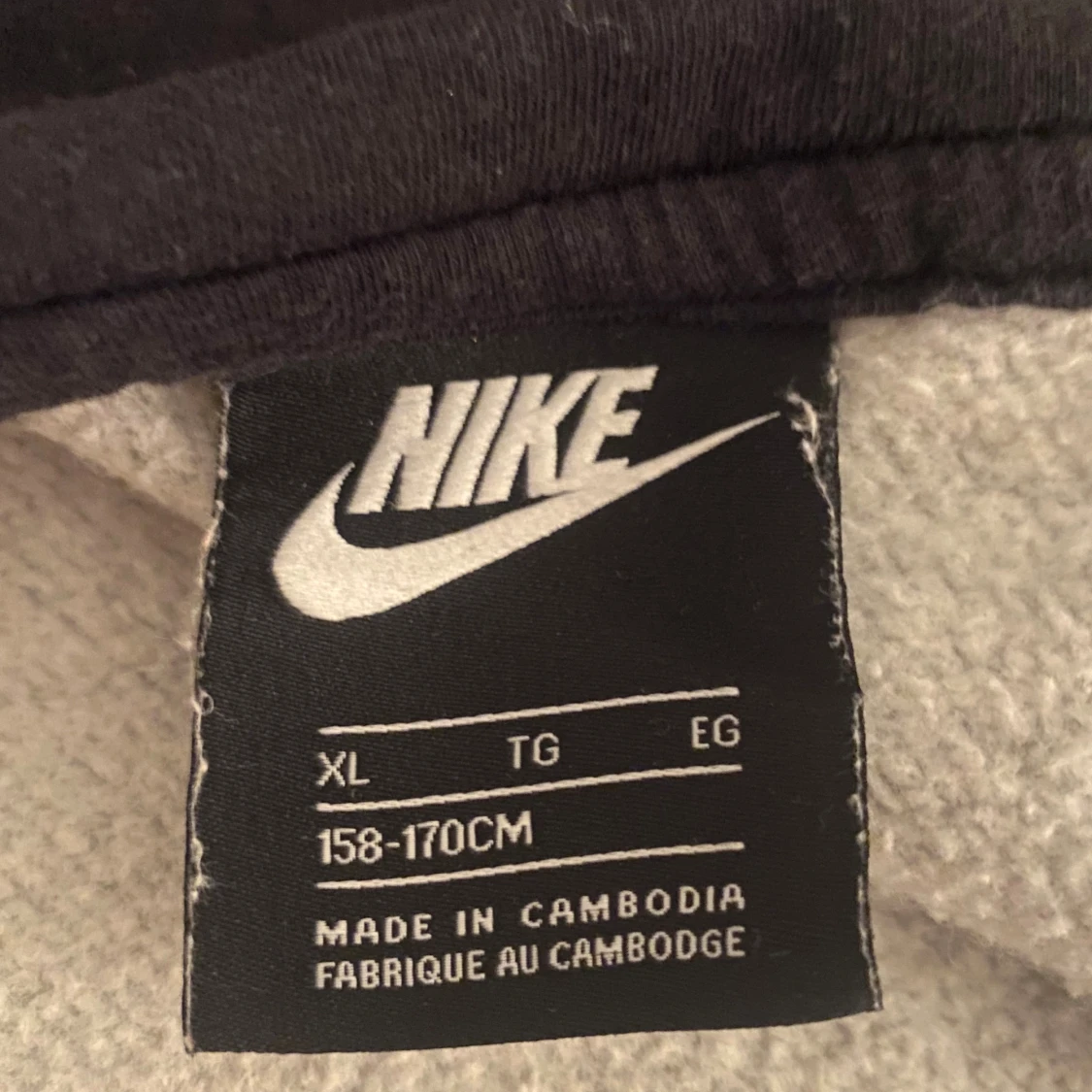 Nike hoodie i grått med svart huva och svart detalj på ärmen med stor vit Nike-logga. Tröjan har dragkedja framtill och klassisk Nike-logga på bröstet. Passar dig som gillar sportig och avslappnad stil. Storlek XL, 158-170 cm.