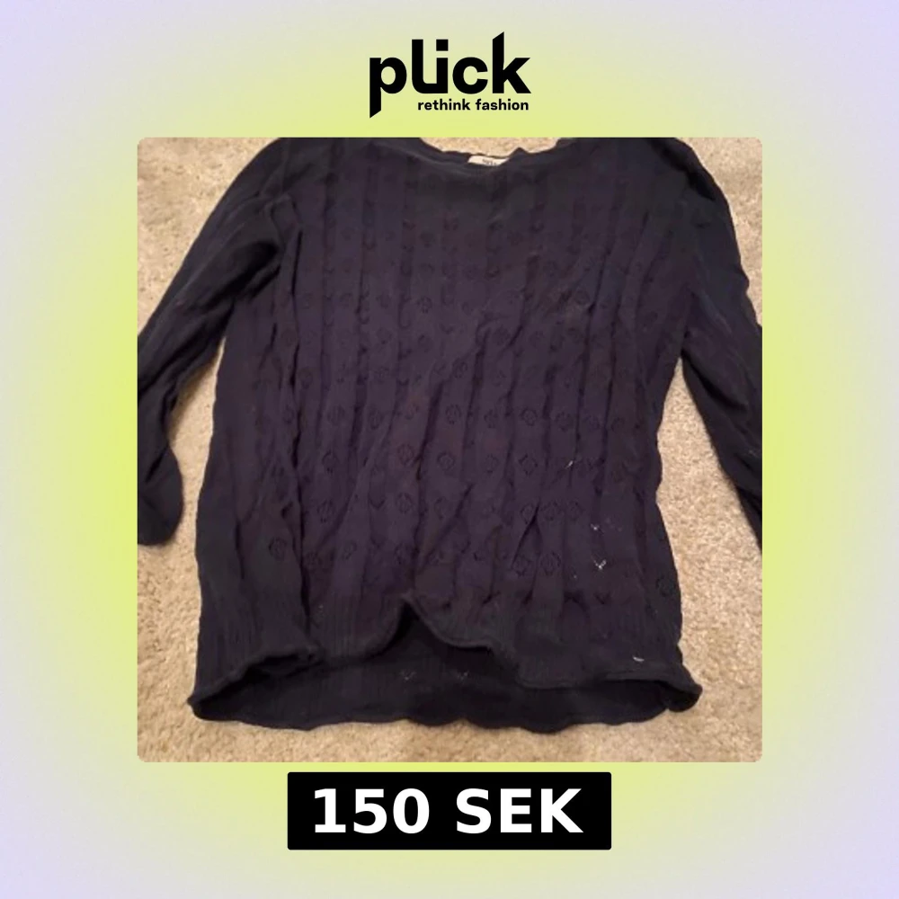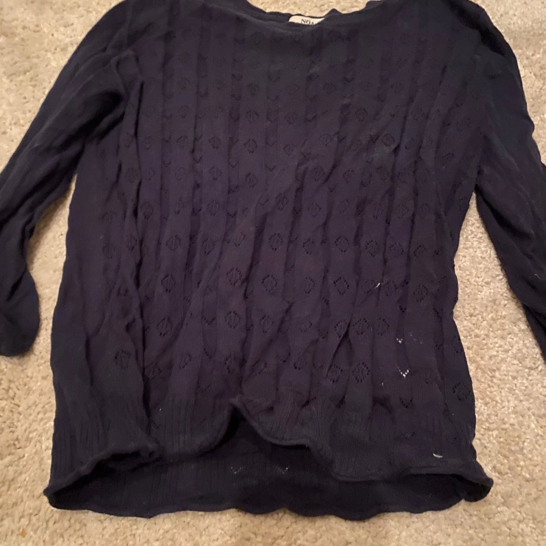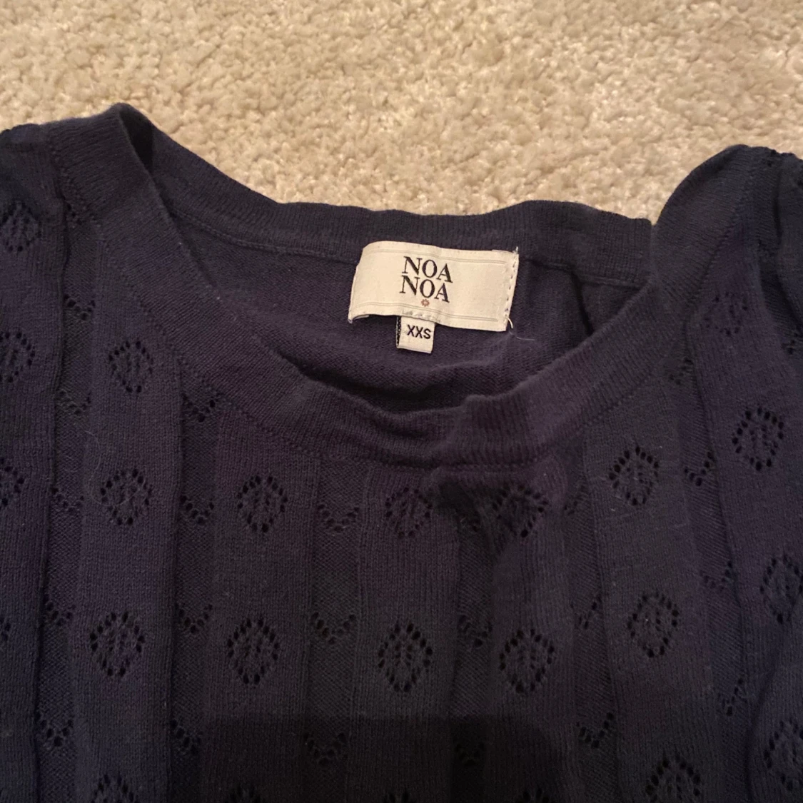 Mörkblå stickad tröja från Noa Noa i storlek XXS. Tröjan har ett diskret hålmönster på framsidan och är trekvartsärmad. Det står XXS men skulle säga att den passar upp till M då den är ganska stor i storleken. Skriv för mer info.