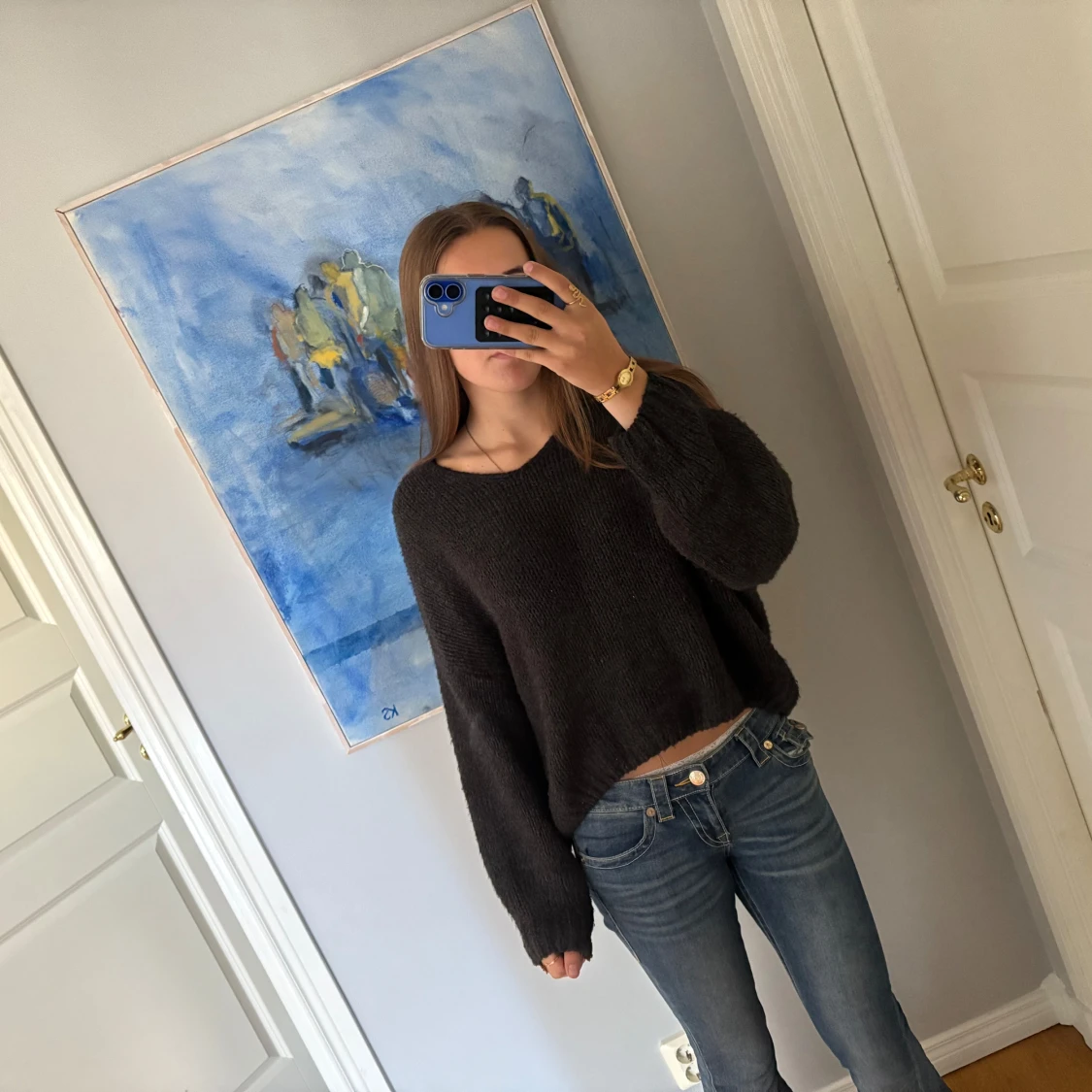 Mysig stickad tröja med oversized passform och långa ärmar. Riktigt snygg säljs då den inte kommer till användning. Passar xs/s/m