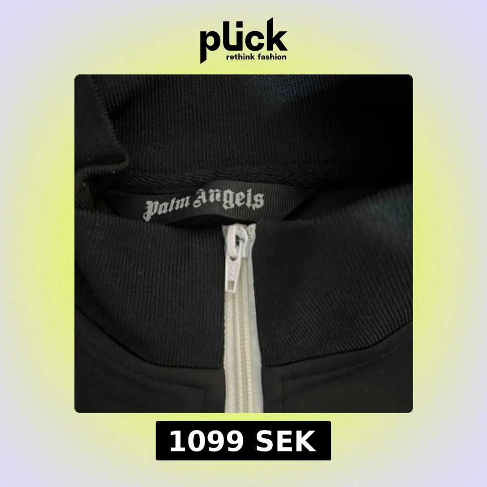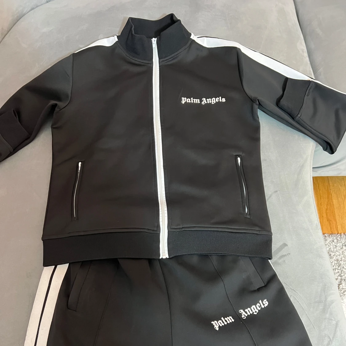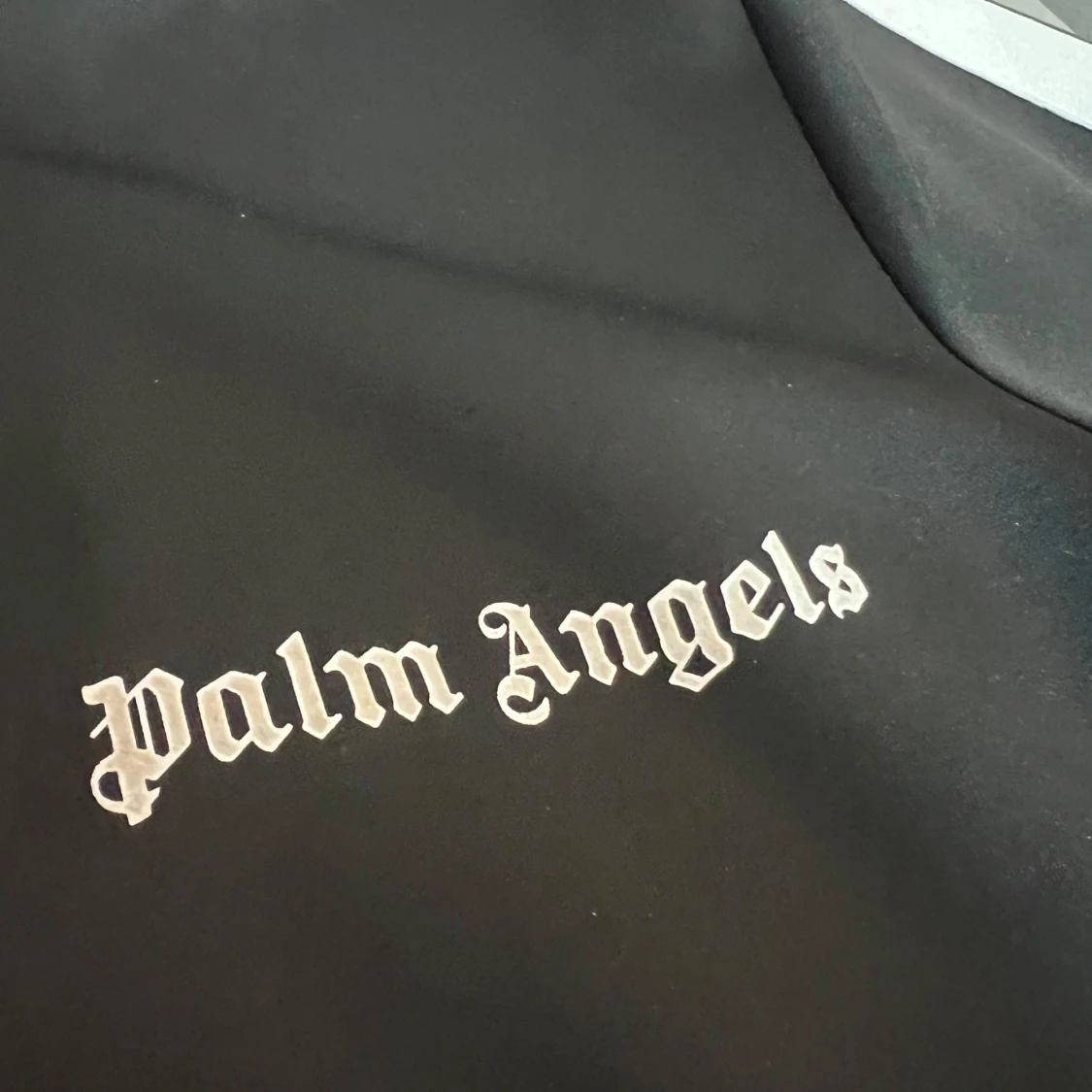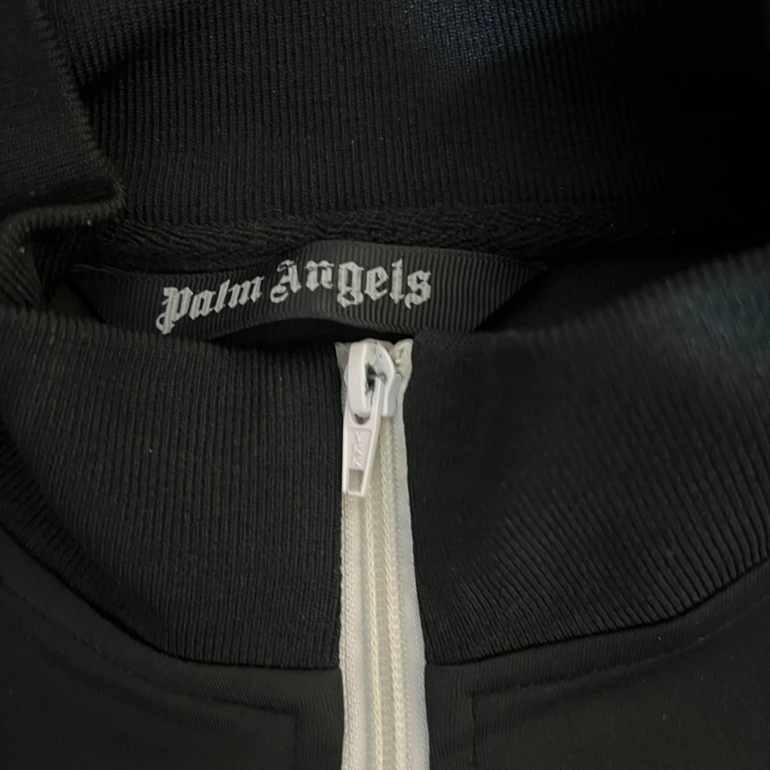 Snygg svart träningsjacka från Palm Angels med vit dragkedja och logga på bröstet. Perfekt för en avslappnad stil.