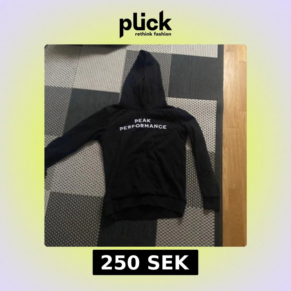 Säljer en stilren svart hoodie från Peak Performance med vit logga på bröstet och en liten logga på ärmen. Tröjan har en klassisk design med huva och långa ärmar. Perfekt för en avslappnad look.
