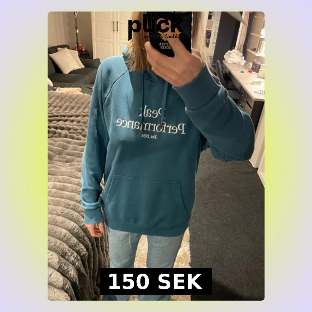 Säljer en blå hoodie från Peak Performance i storlek L. Tröjan har huva med snörning, stor magficka och vit text på bröstet. Mjuk insida och ribbade muddar vid ärmslut och nederkant. Perfekt för chill dagar eller när du vill vara extra comfy.