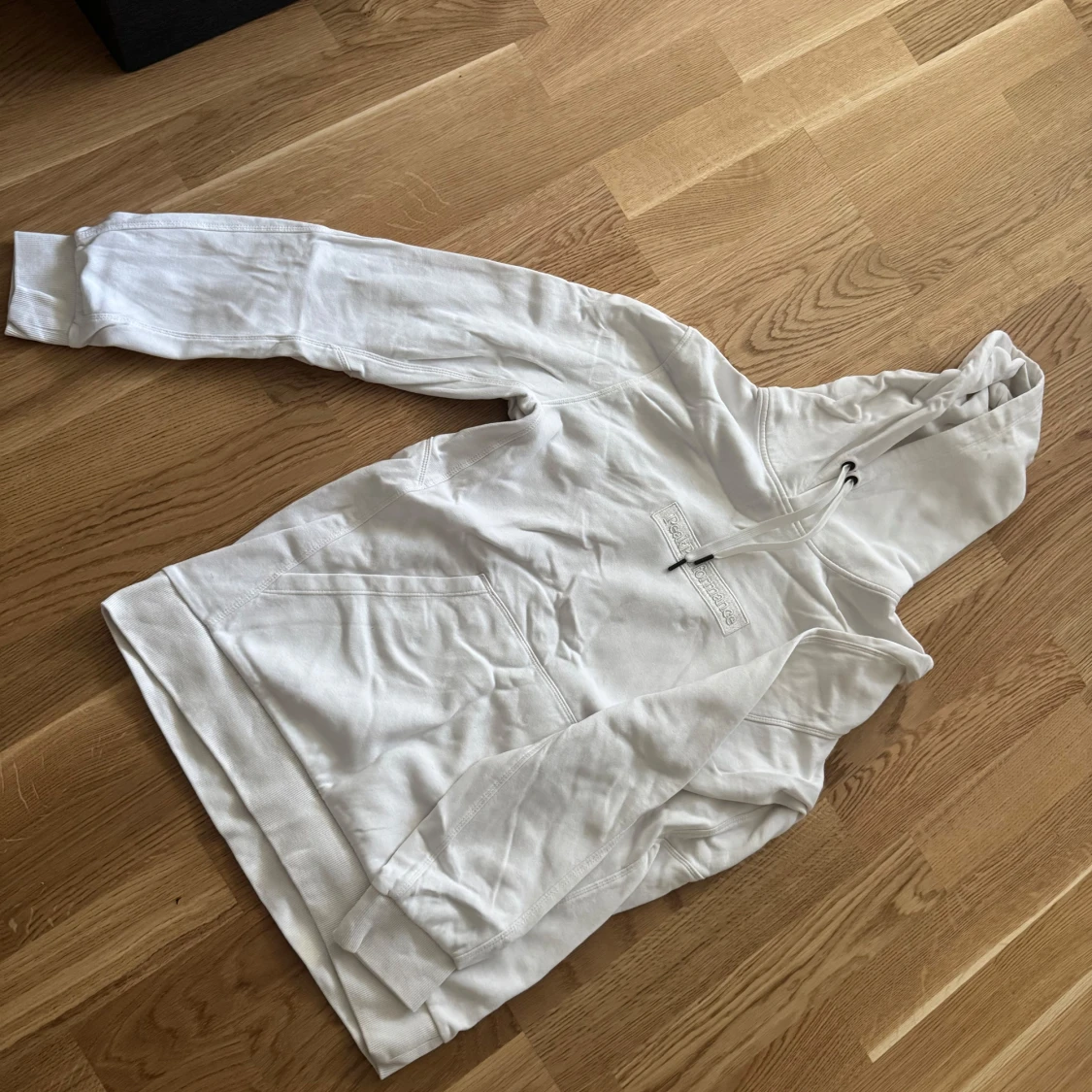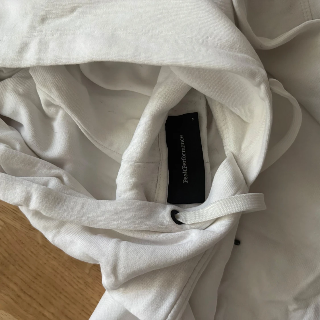 Säljer en stilren vit hoodie från Peak Performance i mjuk bomull. Tröjan har huva med snörning, magficka och klassisk passform. Perfekt för dig som gillar en clean och enkel look. Storlek M.