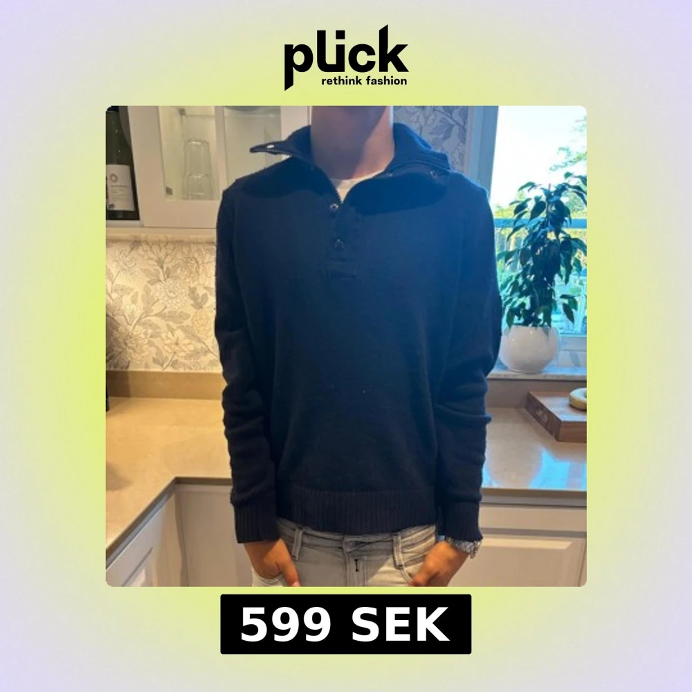 Mörkblå stickad tröja från peak performance med hög krage och knappar framtill. Tröjan har ribbade muddar och en diskret patch på ärmen. Perfekt för kyliga dagar och passar snyggt till jeans.