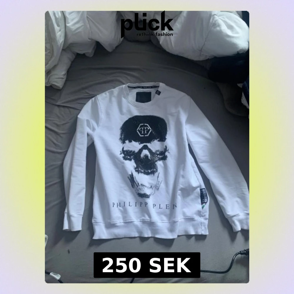 Säljer en vit sweatshirt från Philipp Plein i storlek L med ett stort svart döskalletryck och logga framtill. Tröjan har rund hals, långa ärmar och ribbade muddar. Materialet är mjuk bomull och designen är riktigt edgy med coola detaljer.