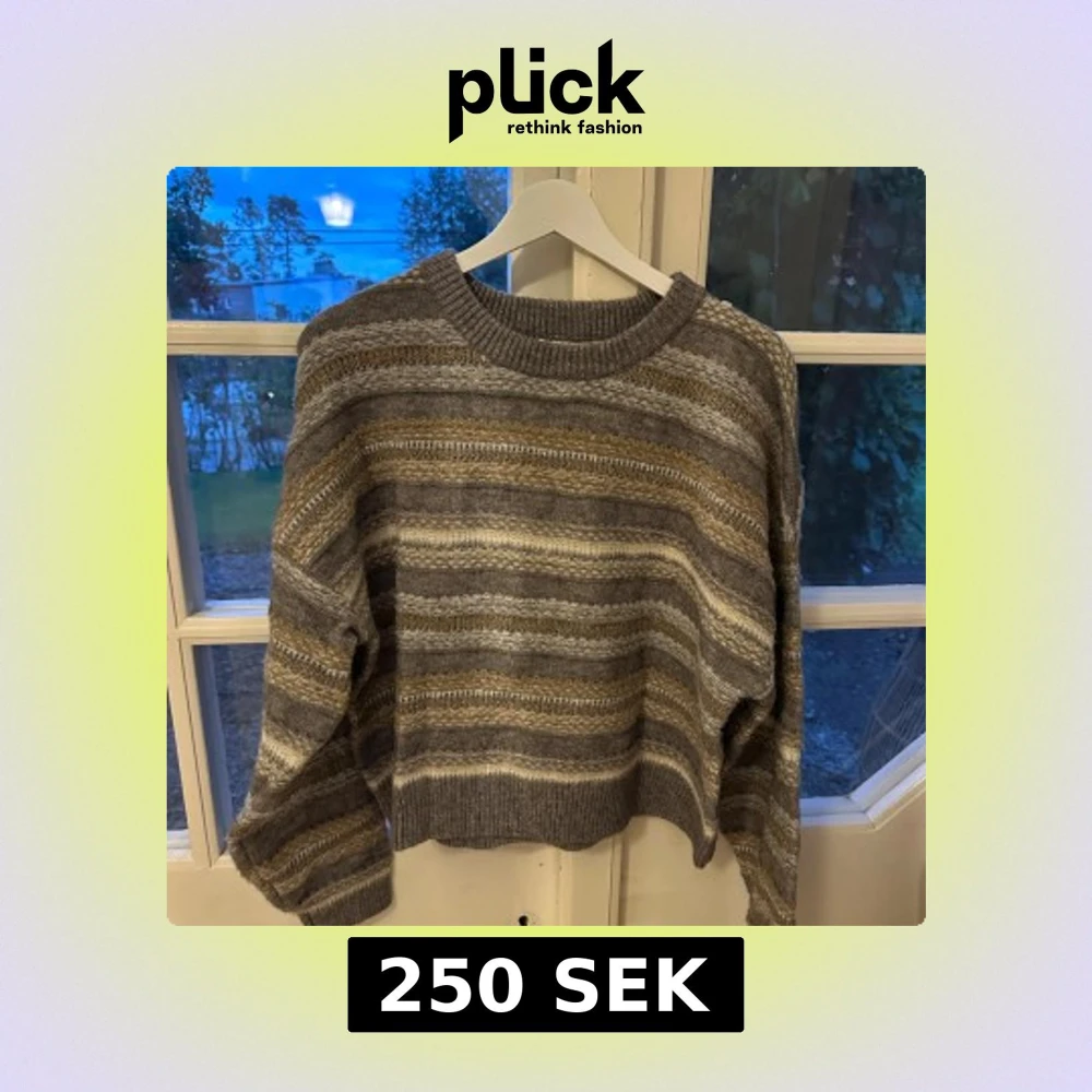 Mysig stickad tröja från Pull&Bear i gråa och beige toner med randigt mönster. Tröjan har rund halsringning, ribbade muddar och lång ärm.