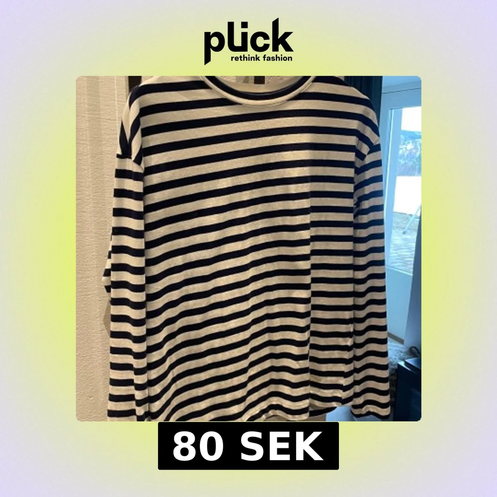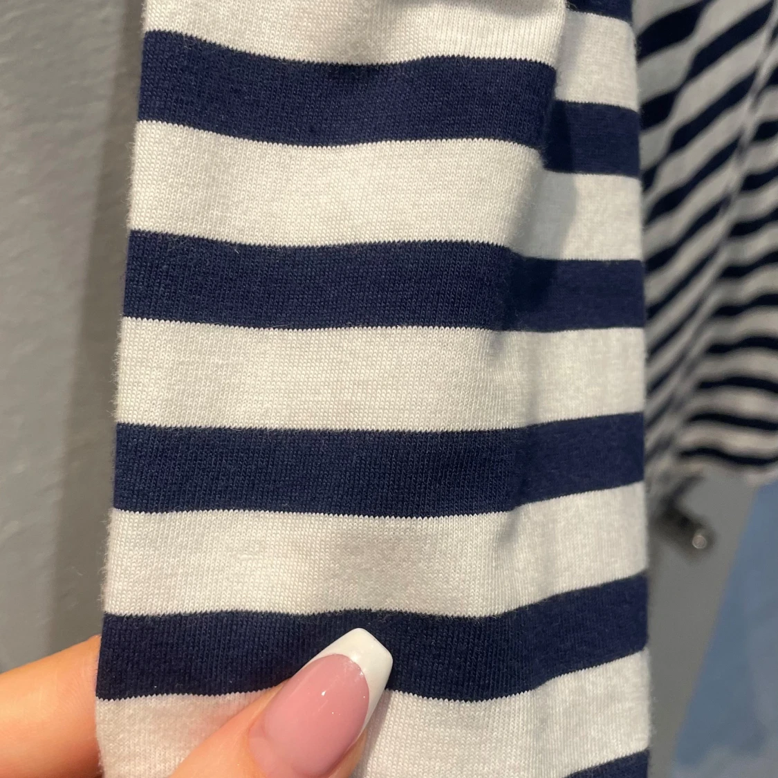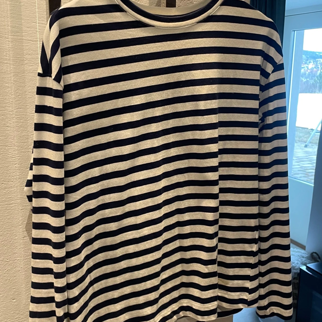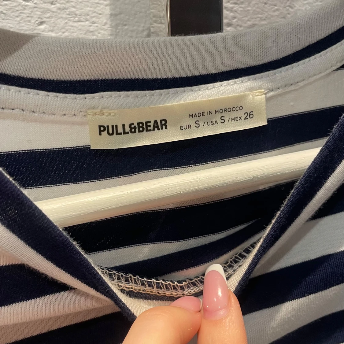 Säljer en randig tröja från Pull&Bear i marinblått och vitt. Tröjan har långa ärmar och är perfekt för en avslappnad stil. Mjukt material.