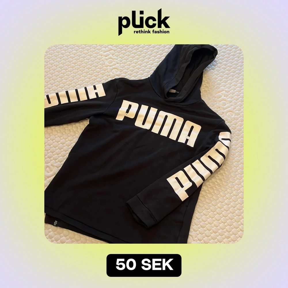 Säljer en svart hoodie från Puma i använt skick. Den har en stor logga på bröstet och ärmarna. DEn är lätt urtvättad i färgen och det finns en liten skada på baksidan, men inget som stör användningen.