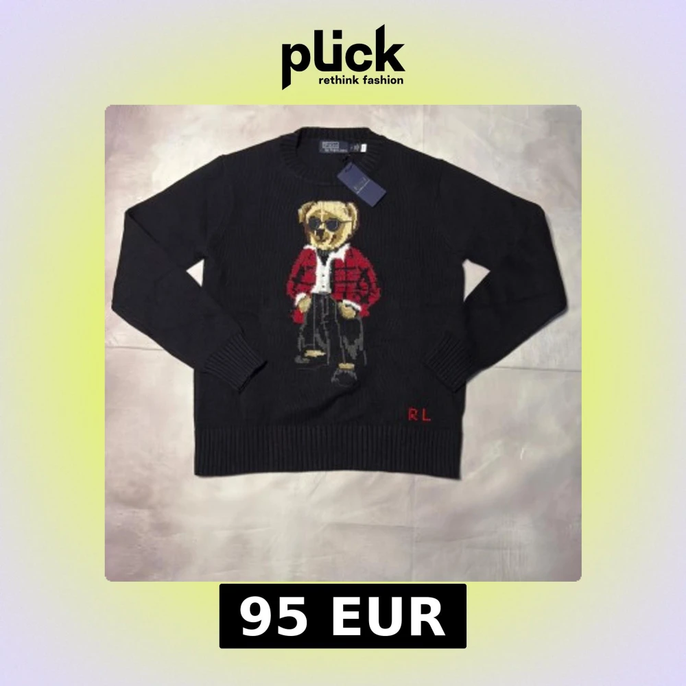 Svart stickad tröja från Polo Ralph Lauren med klassisk Polo Bear-motiv på bröstet. Rund halsringning och ribbade muddar. RL-broderi i rött vid nederkanten. Materialet är mjuk bomull och passformen är normal. Perfekt statement-plagg för dig som gillar ikoniska detaljer.