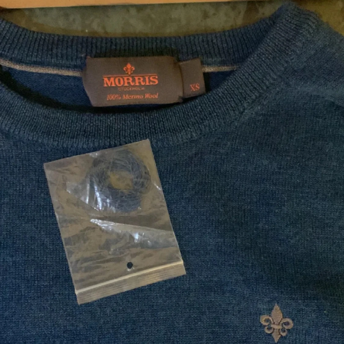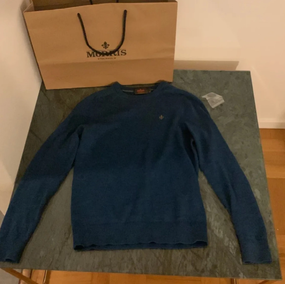 Säljer en snygg, stickad blå tröja från Morris i 100% merinoull. Kommer i originalpåse och allt tillbehör kommer med. Den är i storlek XS och passar någon som är ca 170cm. Vid funderingar är det bara och fråga på. Kom dm för fler bilder. Priset är ej hugget i sten!