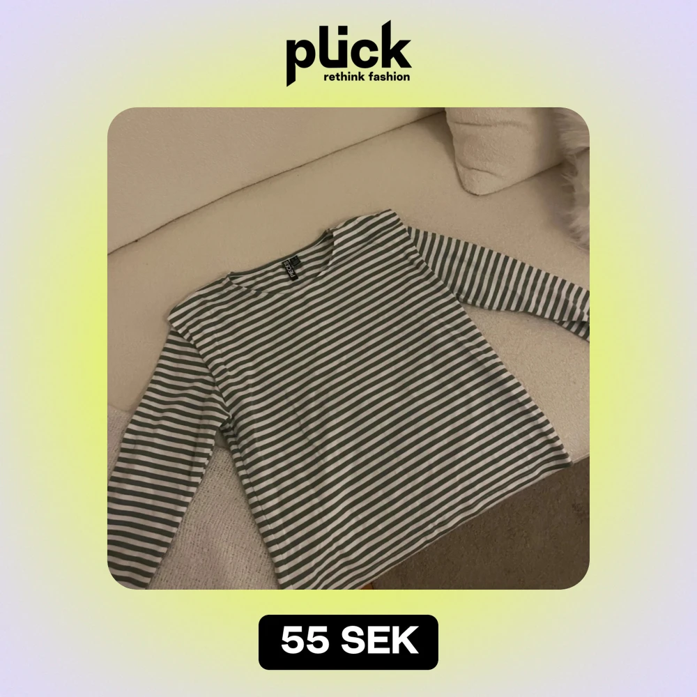 Säljer en randig långärmad tröja från Pieces i grönt och vitt. Perfekt för en avslappnad stil. Tröjan har en klassisk rund hals och är tillverkad i ett mjukt material.