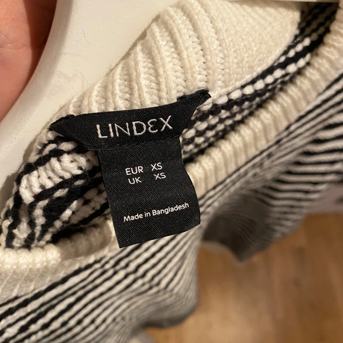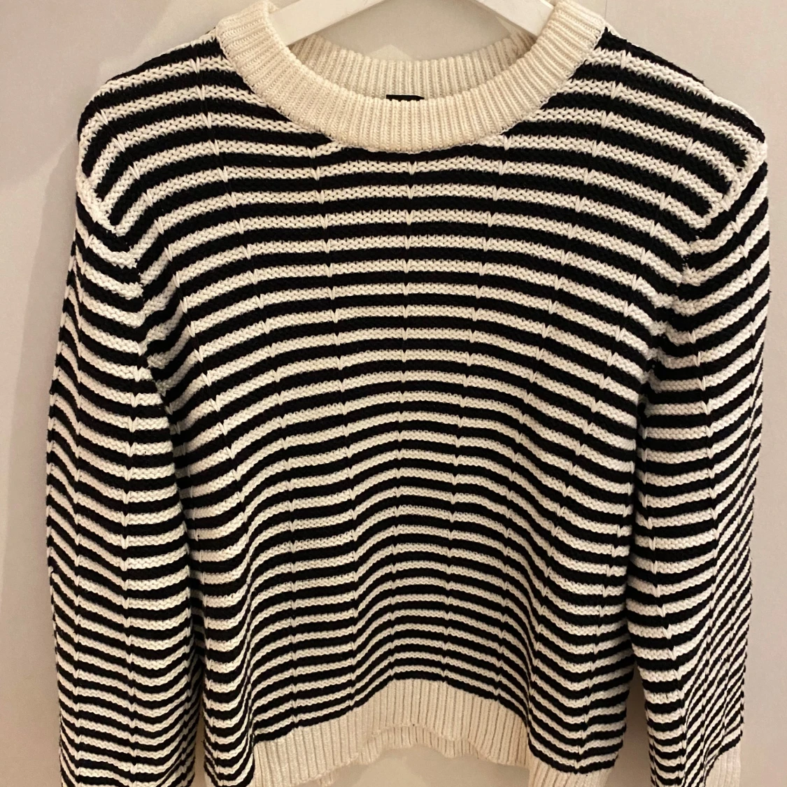Säljer en superfin randig stickad tröja från Lindex i svart och vitt. Den har en bekväm passform med långa ärmar och ribbade kanter vid hals, ärmslut och nederkant. Perfekt för höst och vinter! 🖤🤍