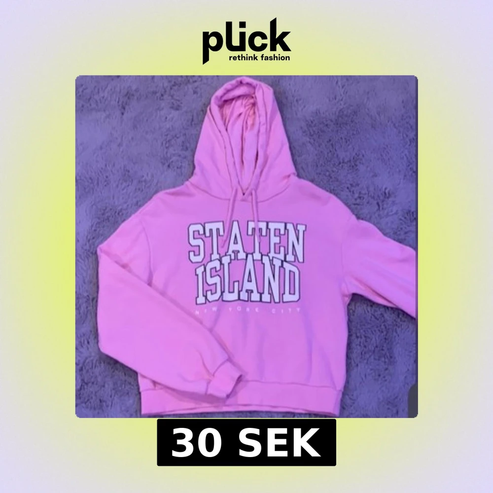 Säljer en rosa hoodie från H&M med texten 'Staten Island New York City' i vitt tryck. Den har en klassisk huva med dragsko och långa ärmar. Perfekt för en avslappnad stil.