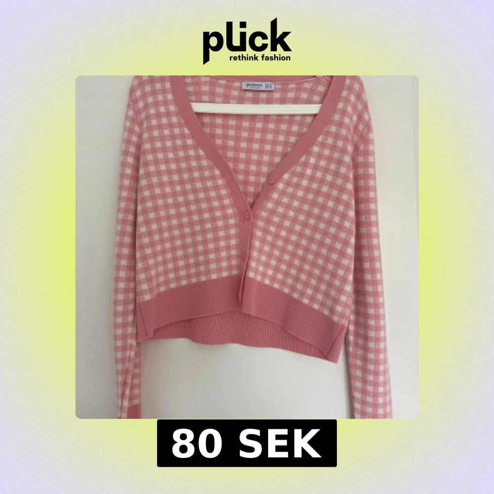 Superfin croppad kofta från Stradivarius i rosa och vitt rutigt mönster. Koftan har v-ringad hals, långa ärmar och knappar framtill. Mjuk stickad kvalitet som känns skön mot huden och passar perfekt till jeans eller kjol.