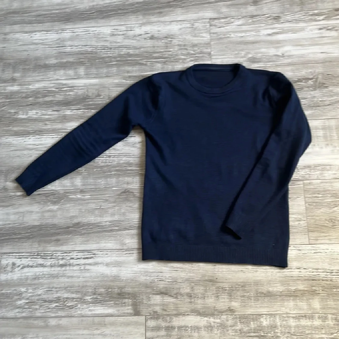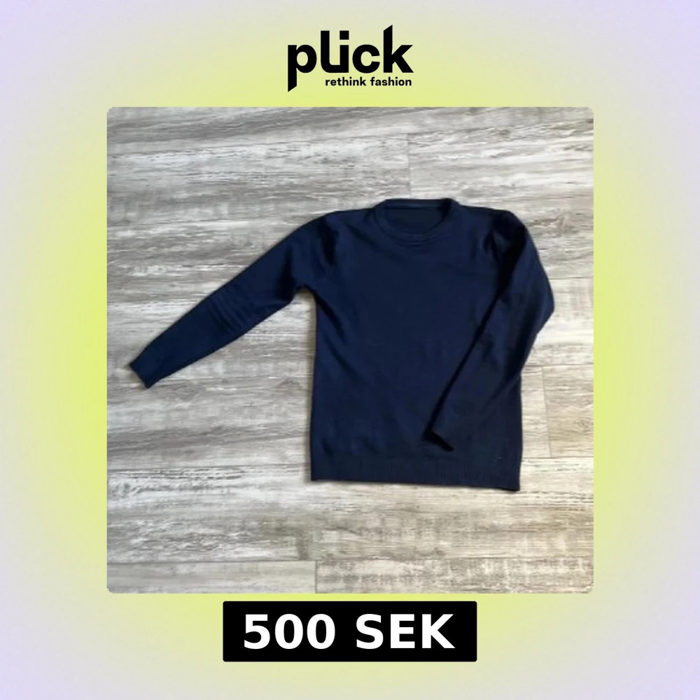 En enkel och stilren mörkblå stickad tröja med rund halsringning och långa ärmar. Perfekt att bära till jeans eller över en skjorta för en clean look.