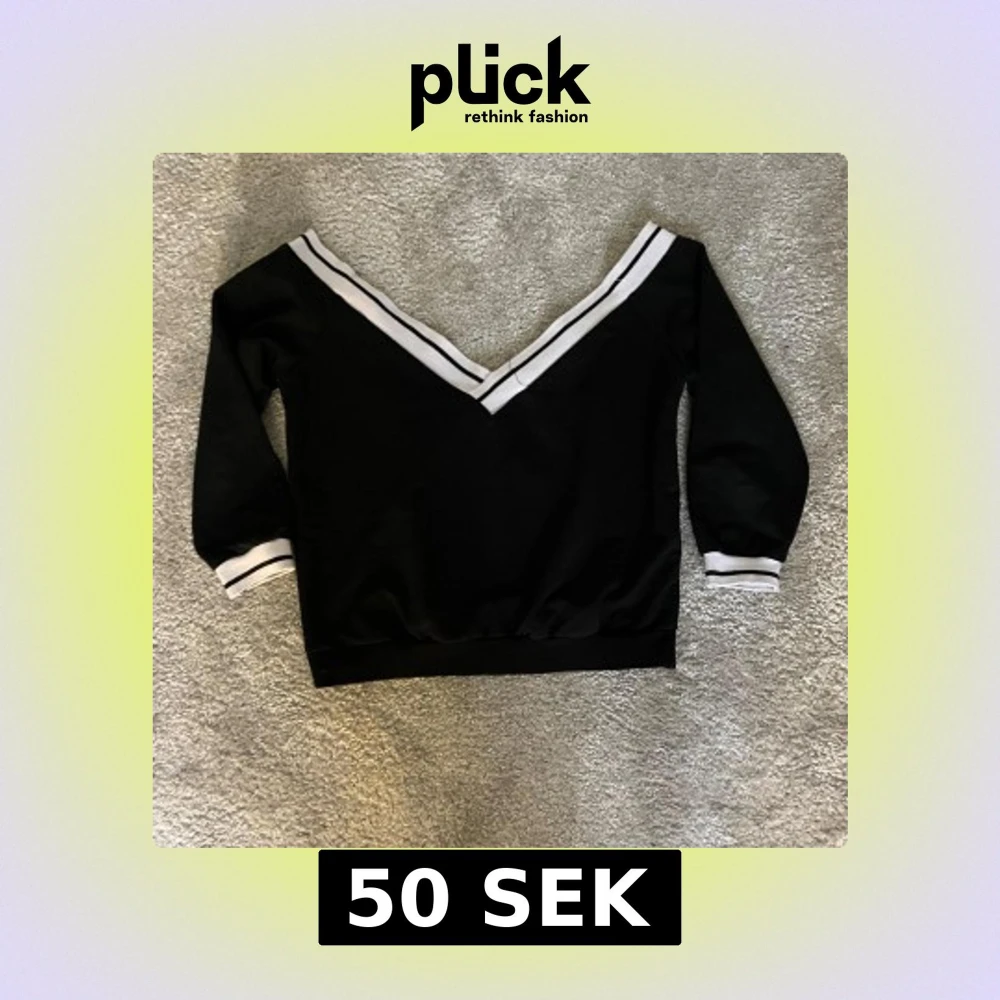 Svart offshoulder tröja med bred v-ringning och vita ränder längs halsringning och ärmslut. Tröjan har trekvartsärm och en loose passform, perfekt för en chill och snygg look. Materialet känns som bomull eller polyester.
