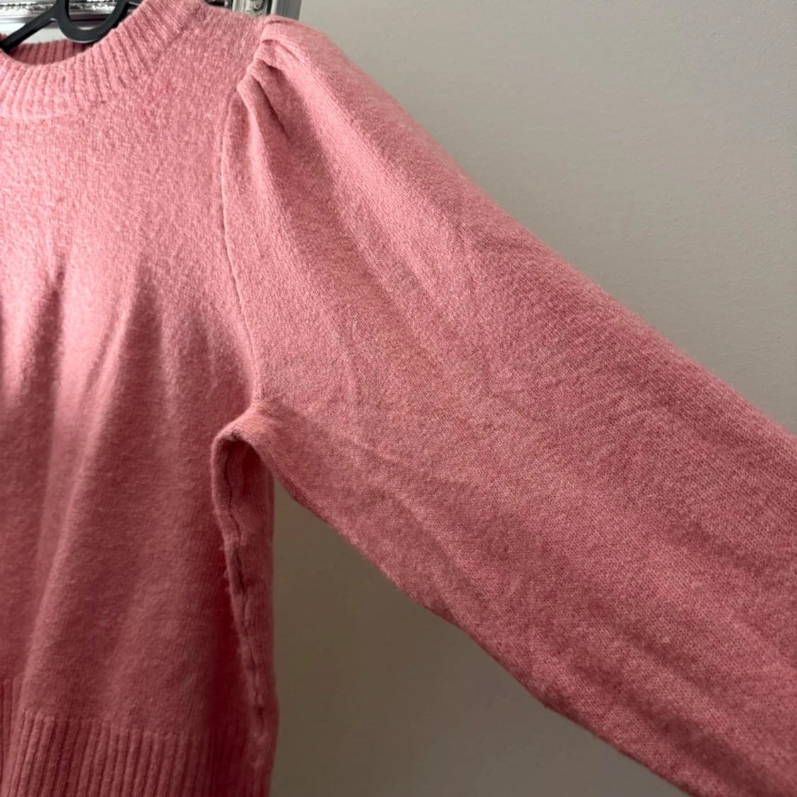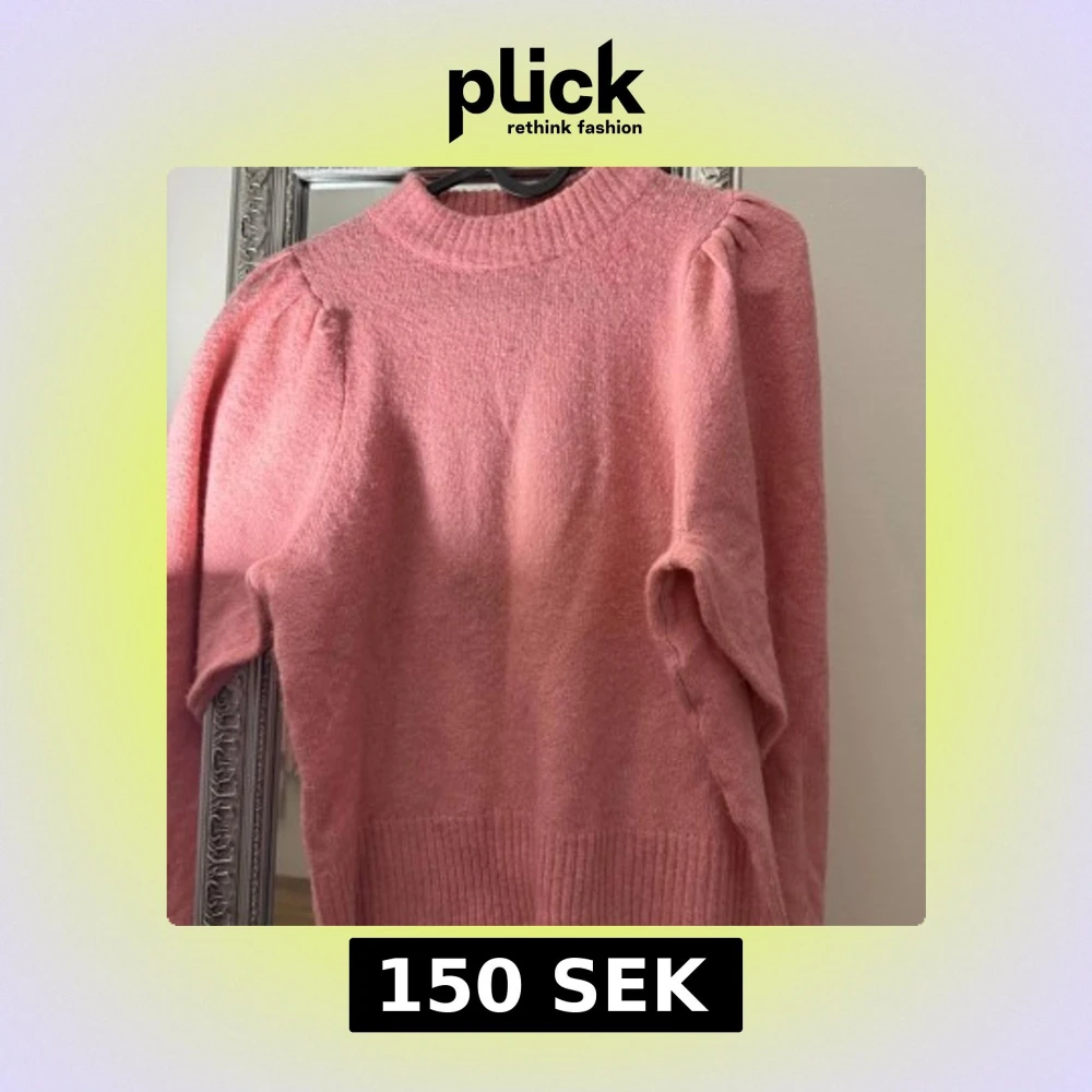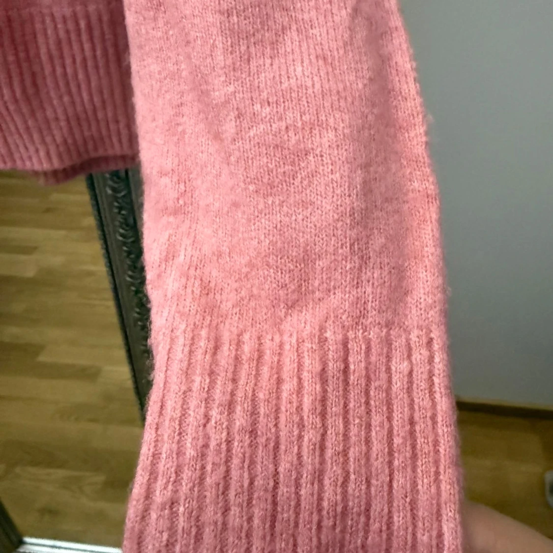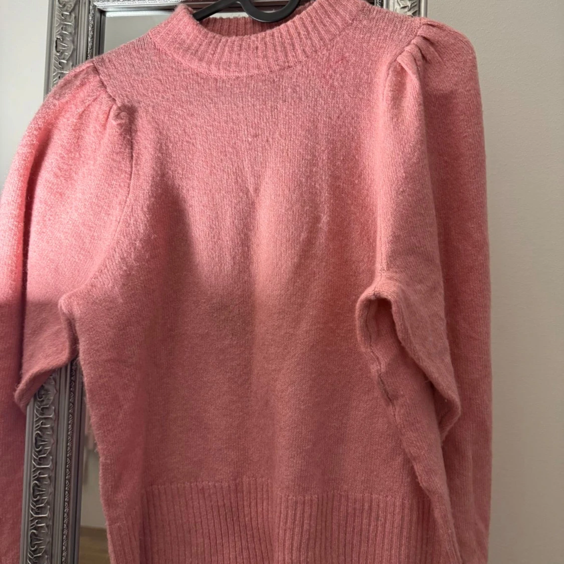 Superfin rosa stickad tröja med puffiga axlar och ribbade muddar. Tröjan har hög hals och är långärmad, perfekt för att hålla sig varm och snygg under kyligare dagar. Mjuk och skön känsla, passar perfekt till jeans eller kjol. I S men passar XS