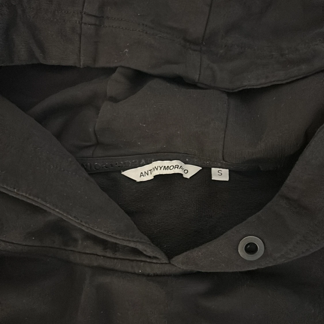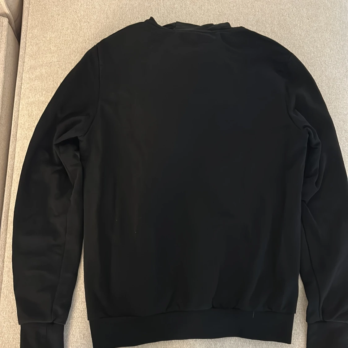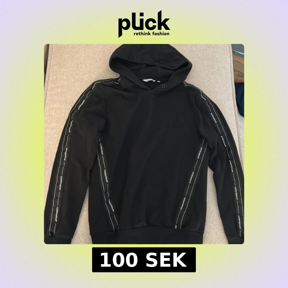 Svart hoodie från Antony Morato i storlek S med huva och långa ärmar. Snygga vita logoremsor längs ärmarna ger en sportig vibe. Tröjan har ribbade muddar och är tillverkad i mjuk bomullsmix som är skön att bära. Perfekt för chill eller streetwear.