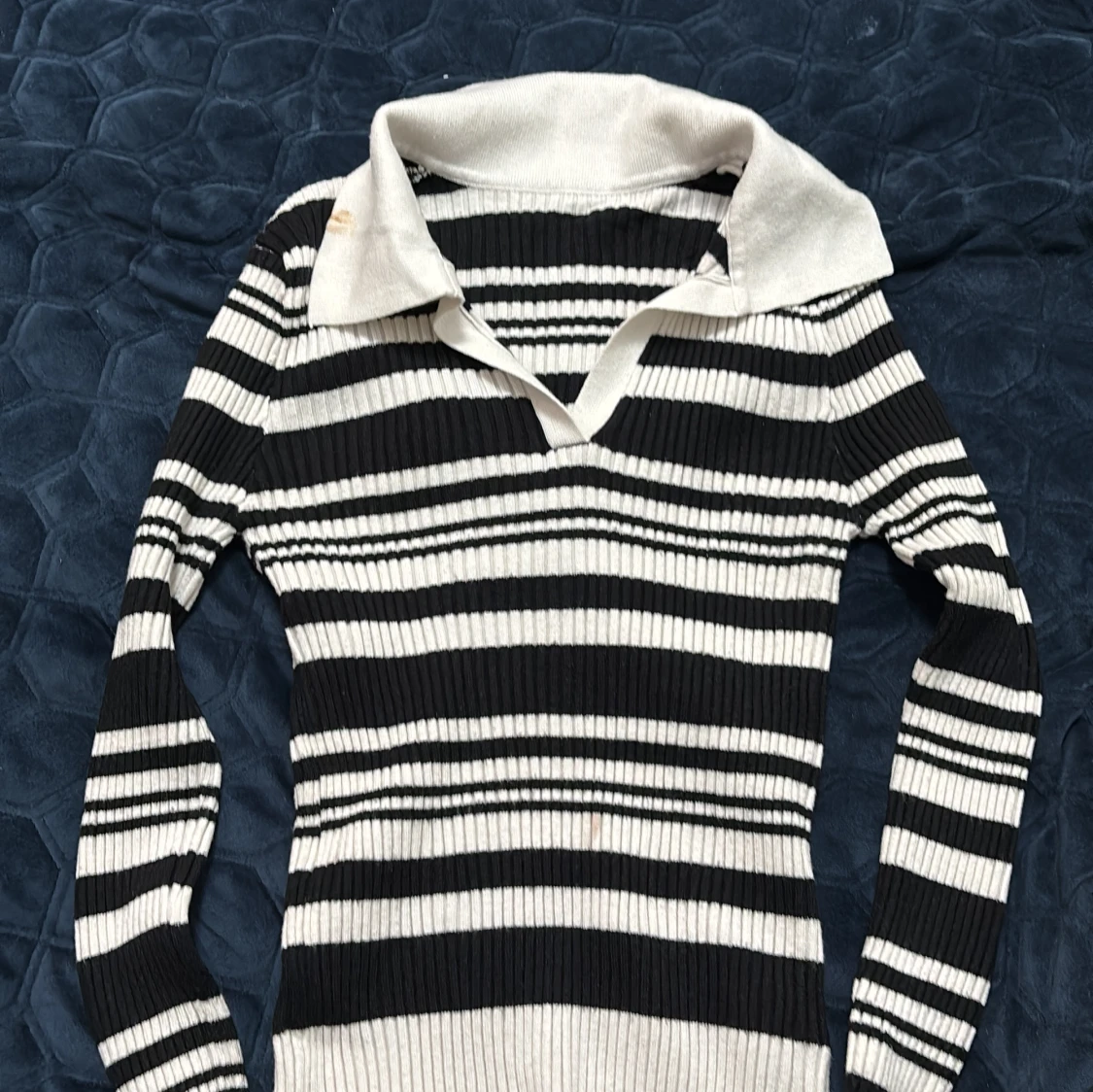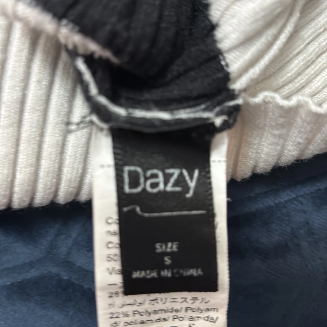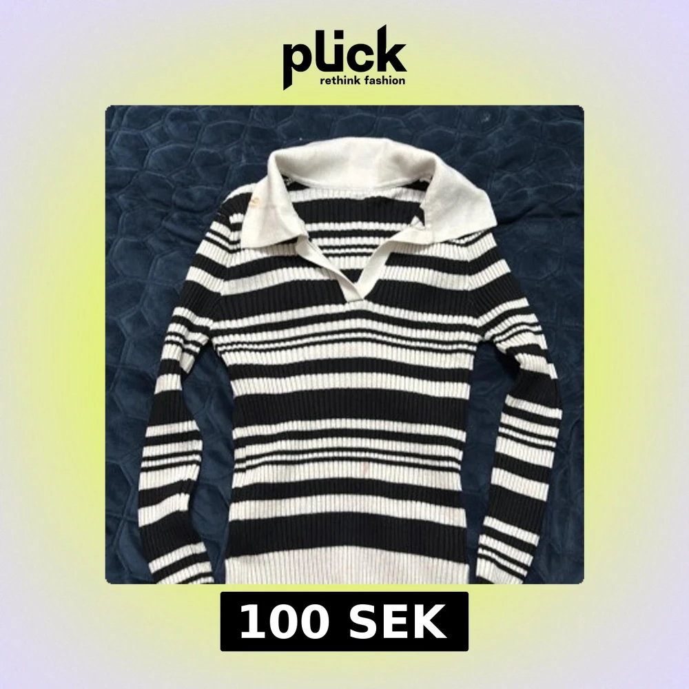 Säljer en svartvit randig ribbad tröja från Dazy i storlek S. Tröjan har lång ärm, bred krage och v-ringning. Den är figurnära och har en snygg, klassisk look med tydliga ränder och stretchigt material.
