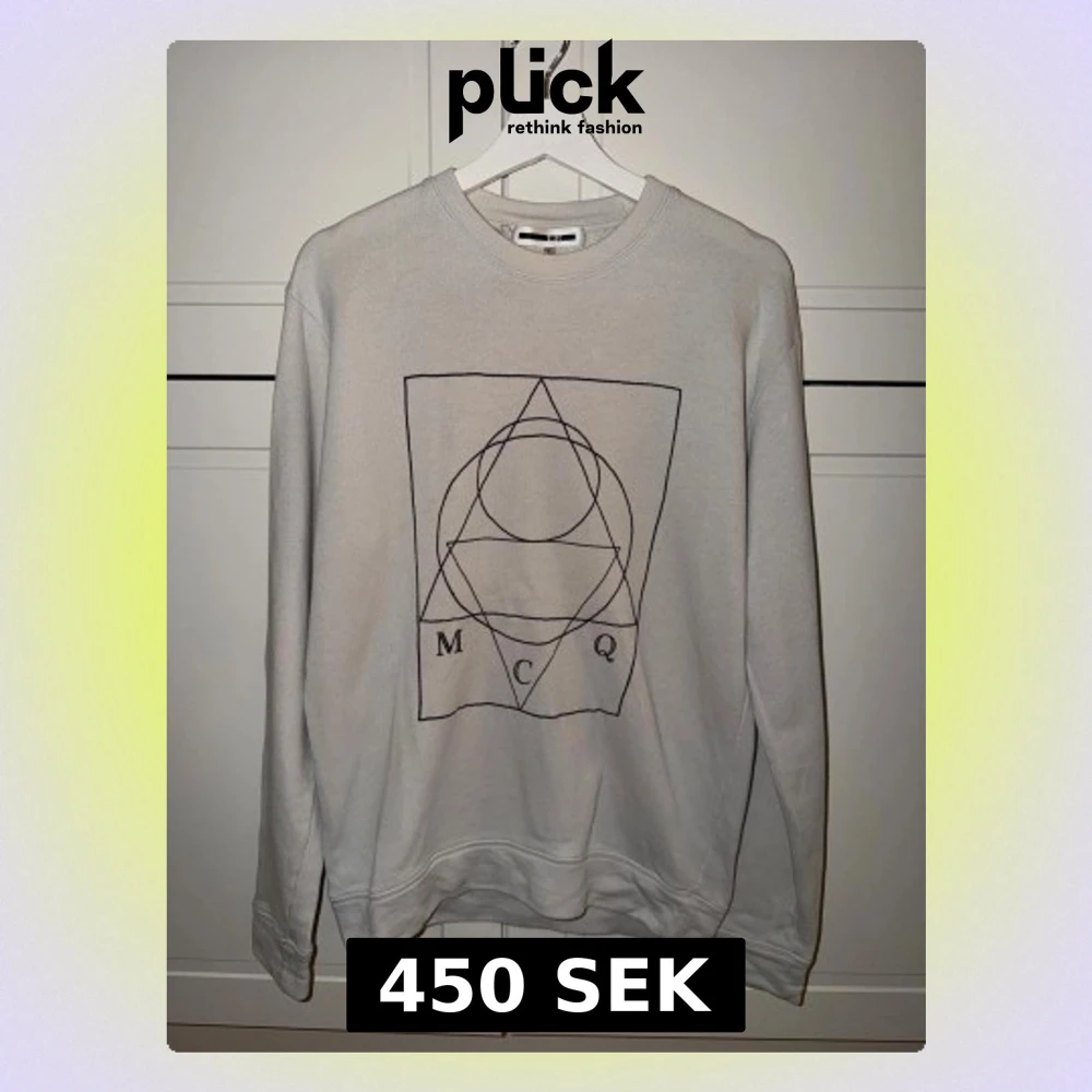 Säljer en clean offwhite färgad sweatshirt från MCQ med ett grafiskt tryck i svart på bröstet. Tröjan har rund hals och långa ärmar, perfekt för dig som gillar minimalistisk stil med en twist. Materialet är mjuk bomull som känns skönt mot huden och är tunn.