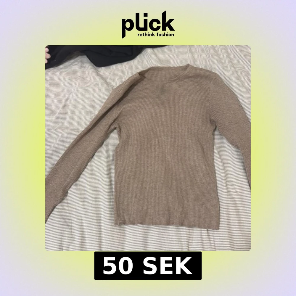 En beige, ribbad långärmad tröja med rund halsringning. Tröjan är figurnära och har en enkel, stilren design som passar perfekt till jeans eller kjol. Materialet känns mjukt och stretchigt, vilket gör den bekväm att bära hela dagen.