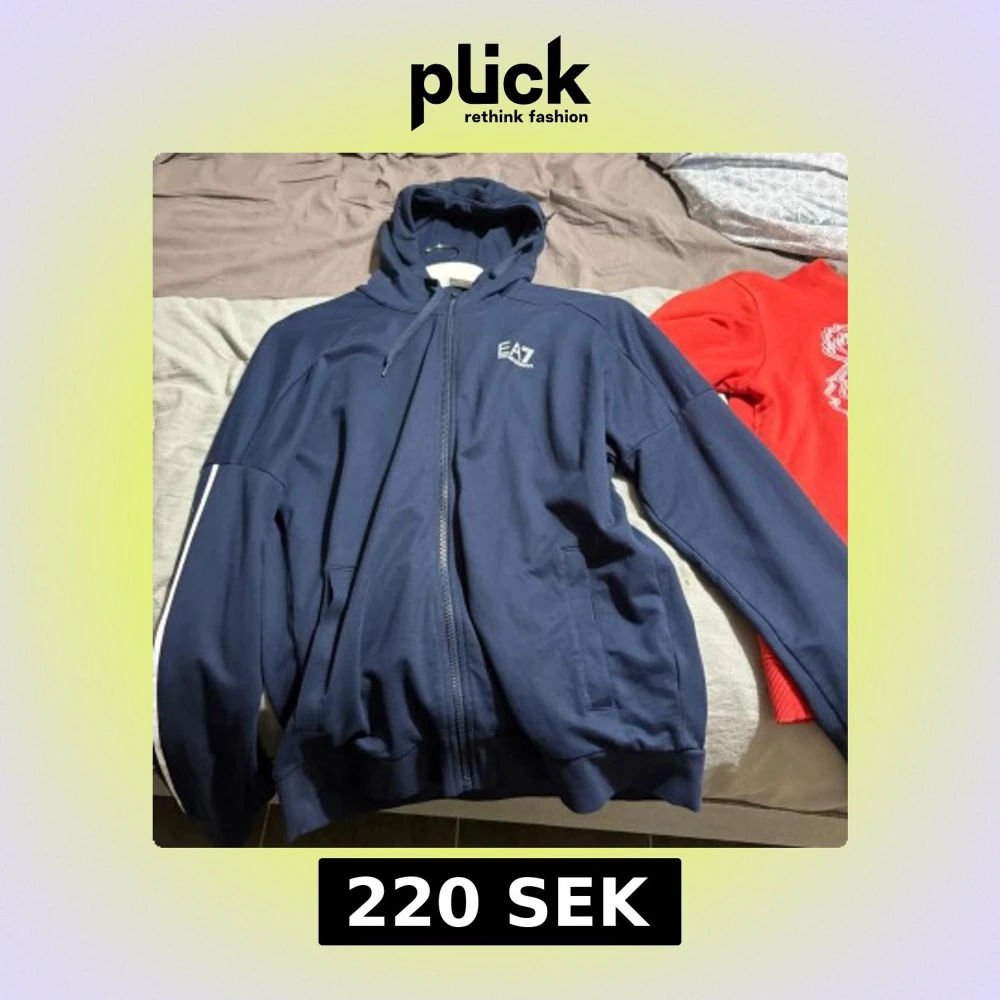 Säljer en marinblå hoodie från EA7 Emporio Armani med dragkedja och huva. Tröjan har snörning i huvan, vita detaljer på ärmen och EA7-logga på bröstet. Perfekt för en sportig och avslappnad stil.