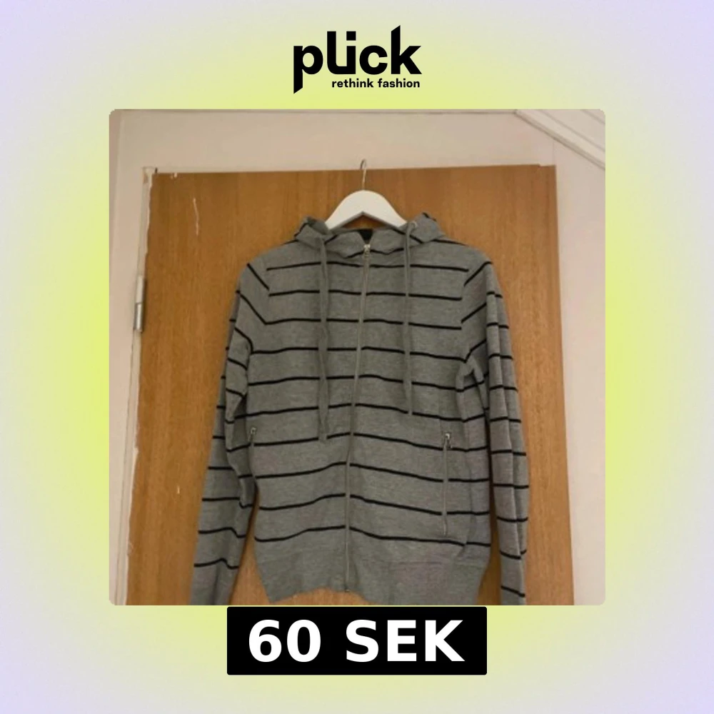 Grå hoodie med svarta ränder och hel dragkedja framtill. Tröjan har huva med snören och två fickor med dragkedja.