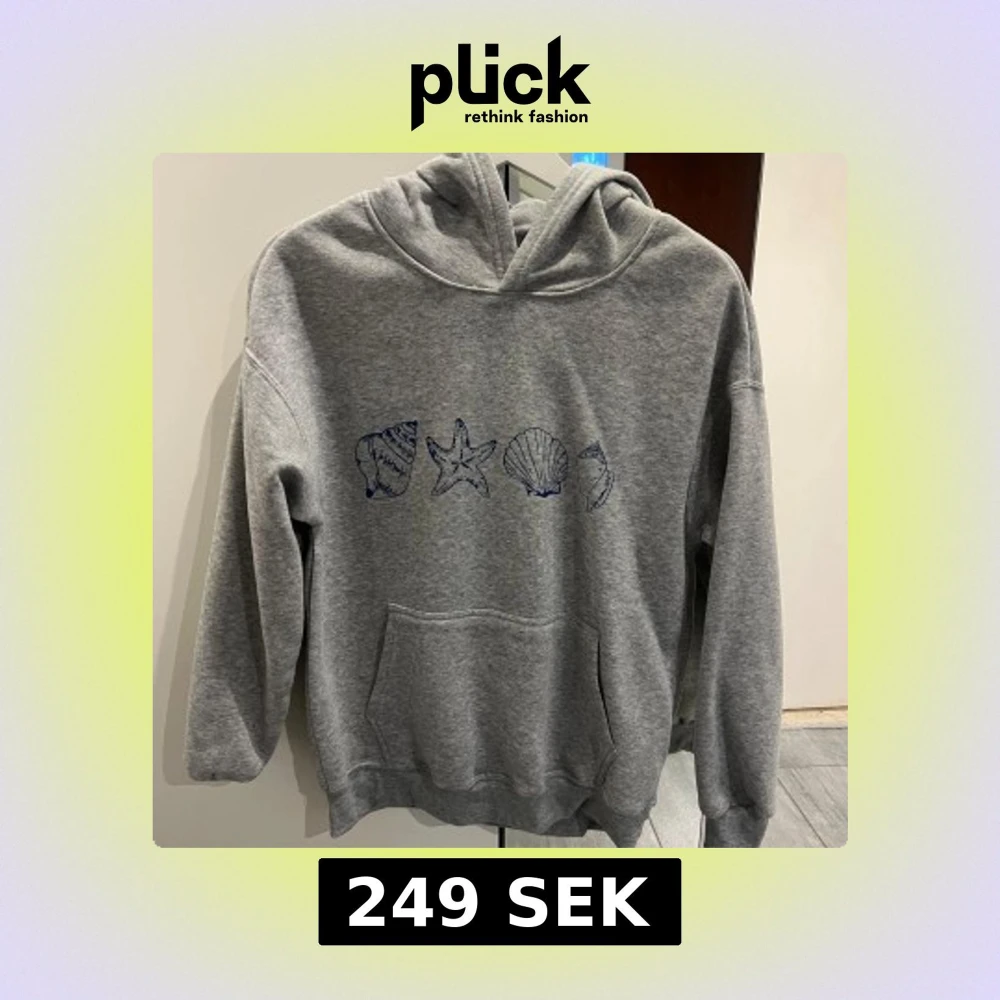 Grå hoodie med blåa snäckmotiv framtill. Aldrig använd