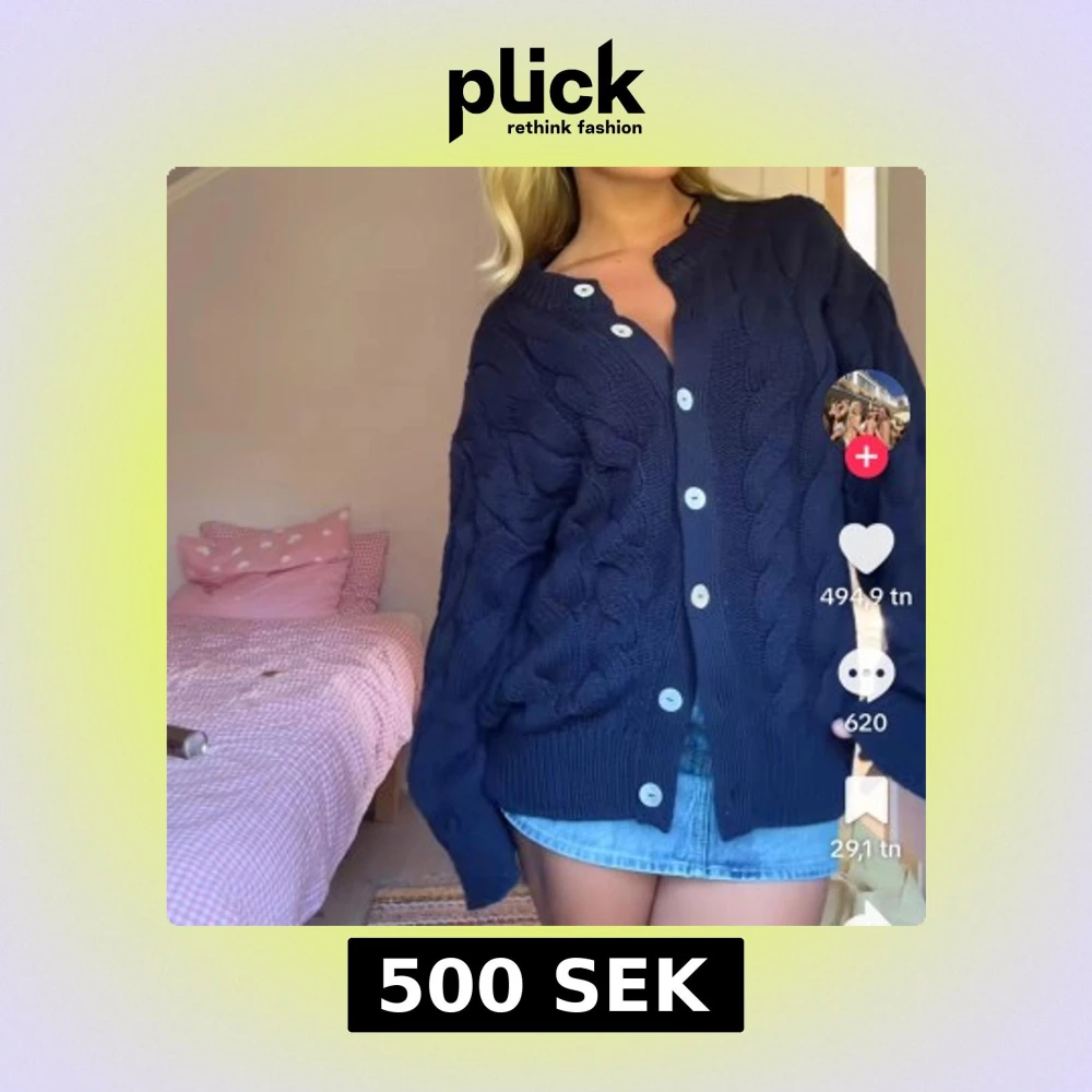 Mysig mörkblå kabelstickad kofta med stora vita knappar framtill. Koftan har en oversized passform, långa ärmar och ribbade muddar. Perfekt att slänga över en t-shirt eller linne för en chill look. Lapp kvar - lånade bilder