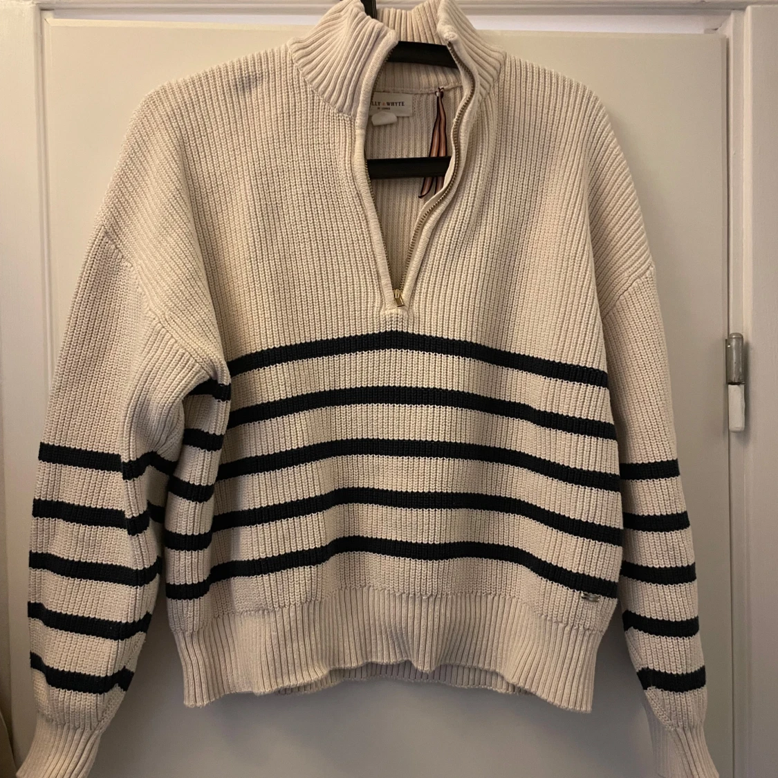 Krämvit/Beige stickad tröja från Holly & Whyte. Marinblå ränder. Storlek S