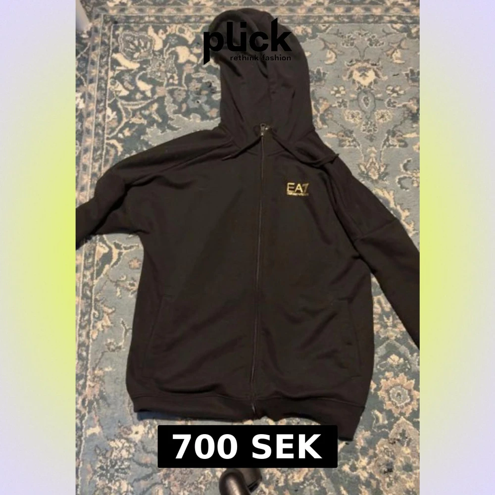 Svart hoodie från EA7 Emporio Armani med guldtryck på bröstet och en stor cirkulär guldlogga på ryggen. Tröjan har huva med snörning, hel dragkedja och två fickor framtill. Perfekt för dig som gillar streetwear och snygga detaljer.