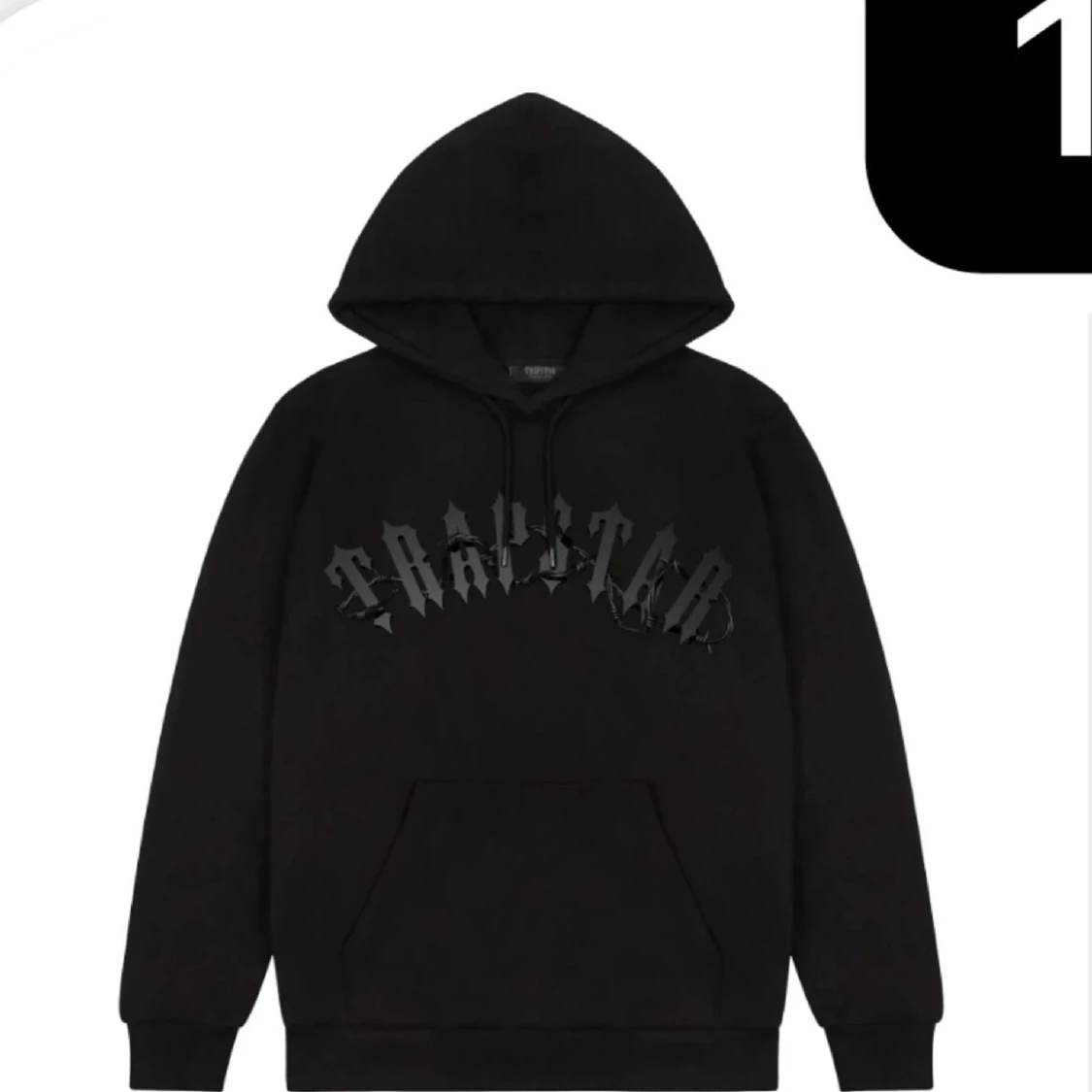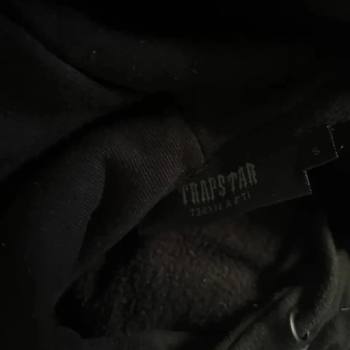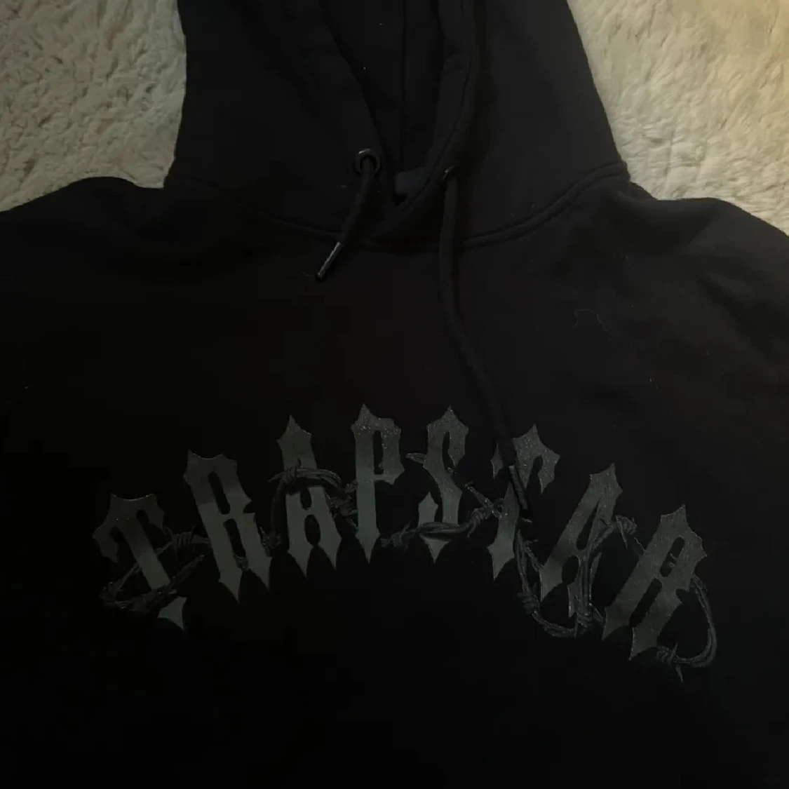 Svart hoodie från Trapstar med ikoniskt tryck i grått framtill. Klassisk känguruficka, huva med snörning och mjukt material. Perfekt för dig som gillar streetwear och vill sticka ut med en edgy look.