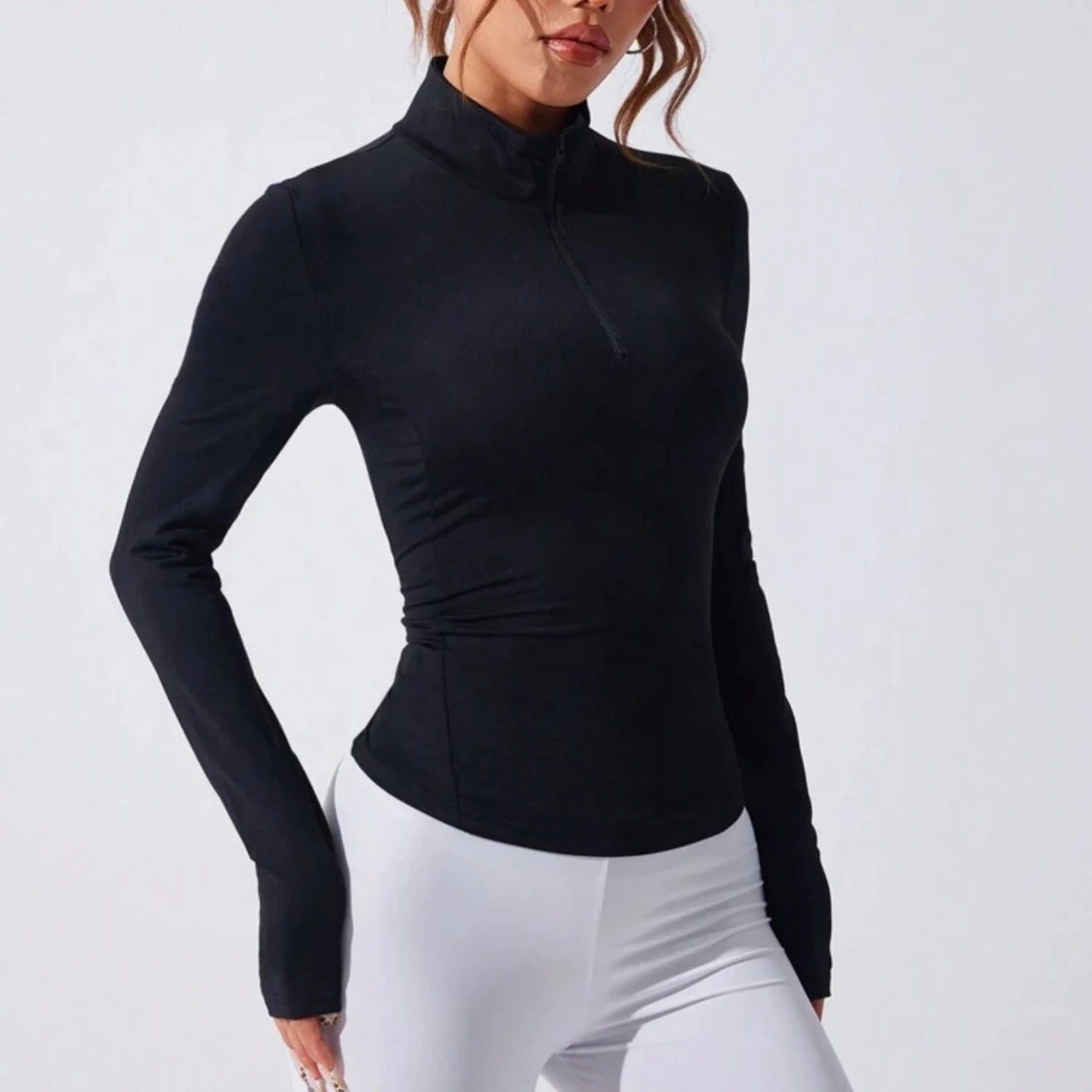 Koftan är svart/mörkblå ❗️ Slimmad svart långärmad träningströja med hög krage och half zip framtill. Tröjan är tillverkad i ett stretchigt material som sitter tight mot kroppen och har tumhål vid ärmsluten. Perfekt för gymmet eller löprundan.