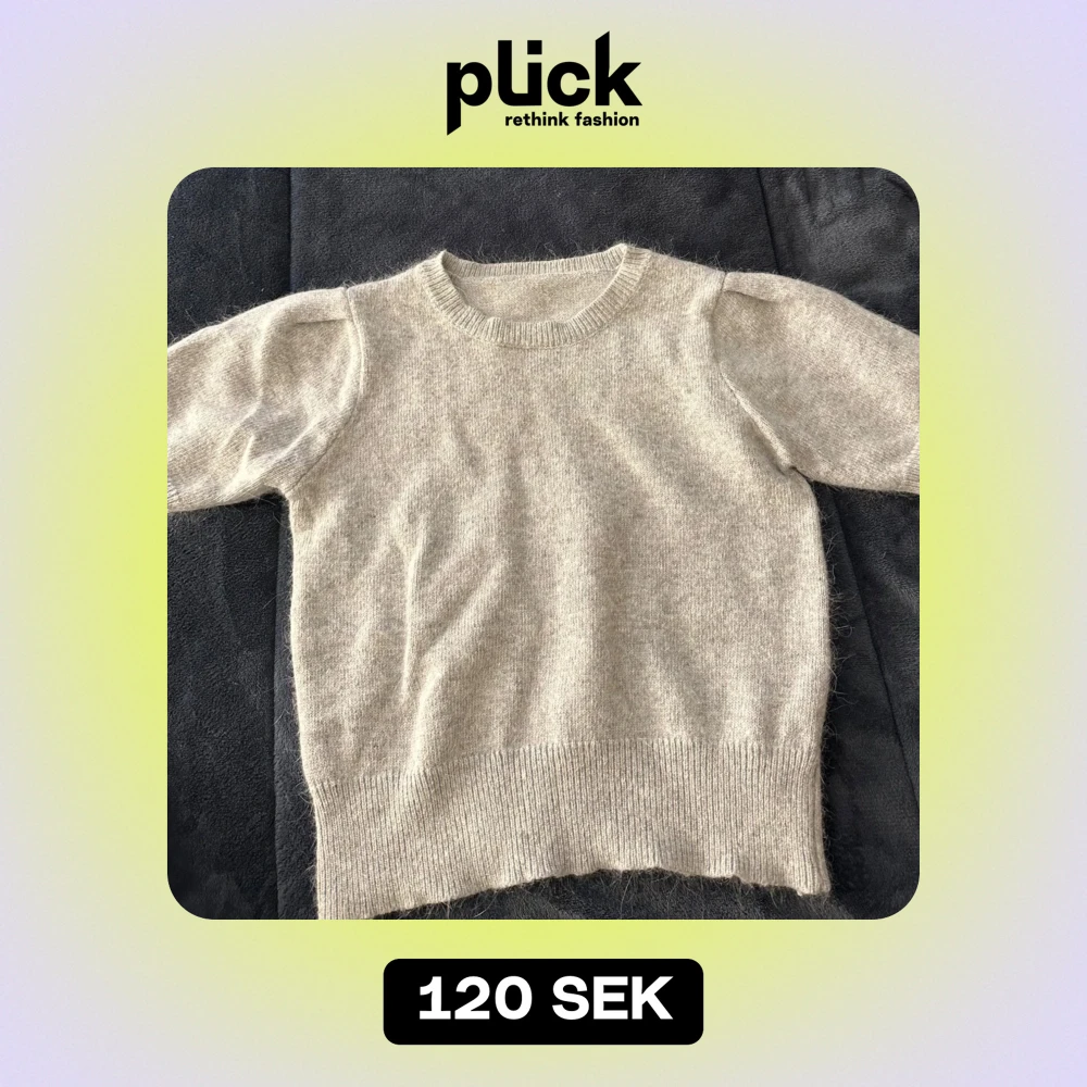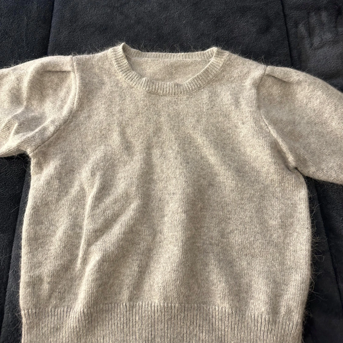 Mysig beige stickad tröja med korta ärmar och rund hals. Perfekt för kyliga dagar och enkel att matcha med olika outfits.