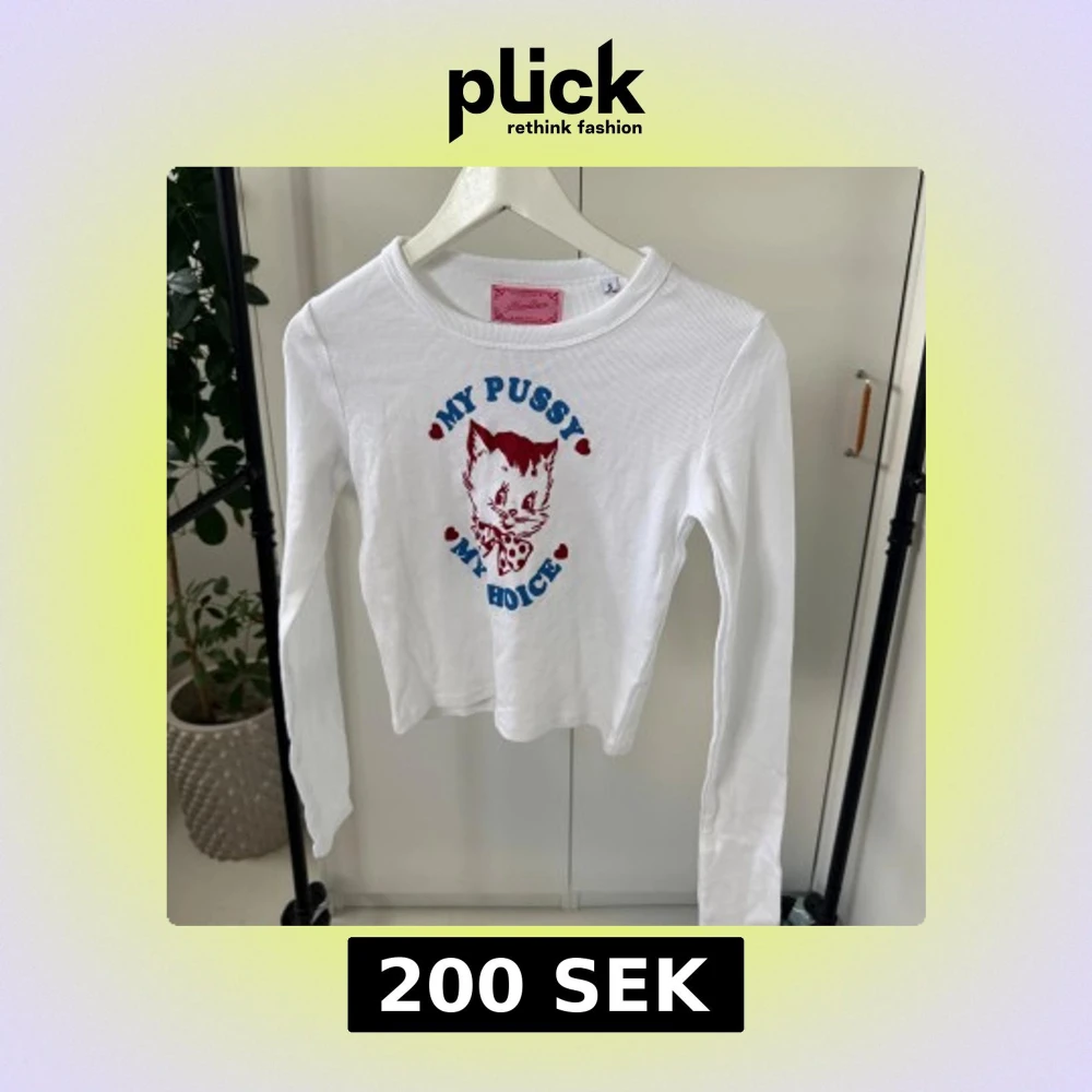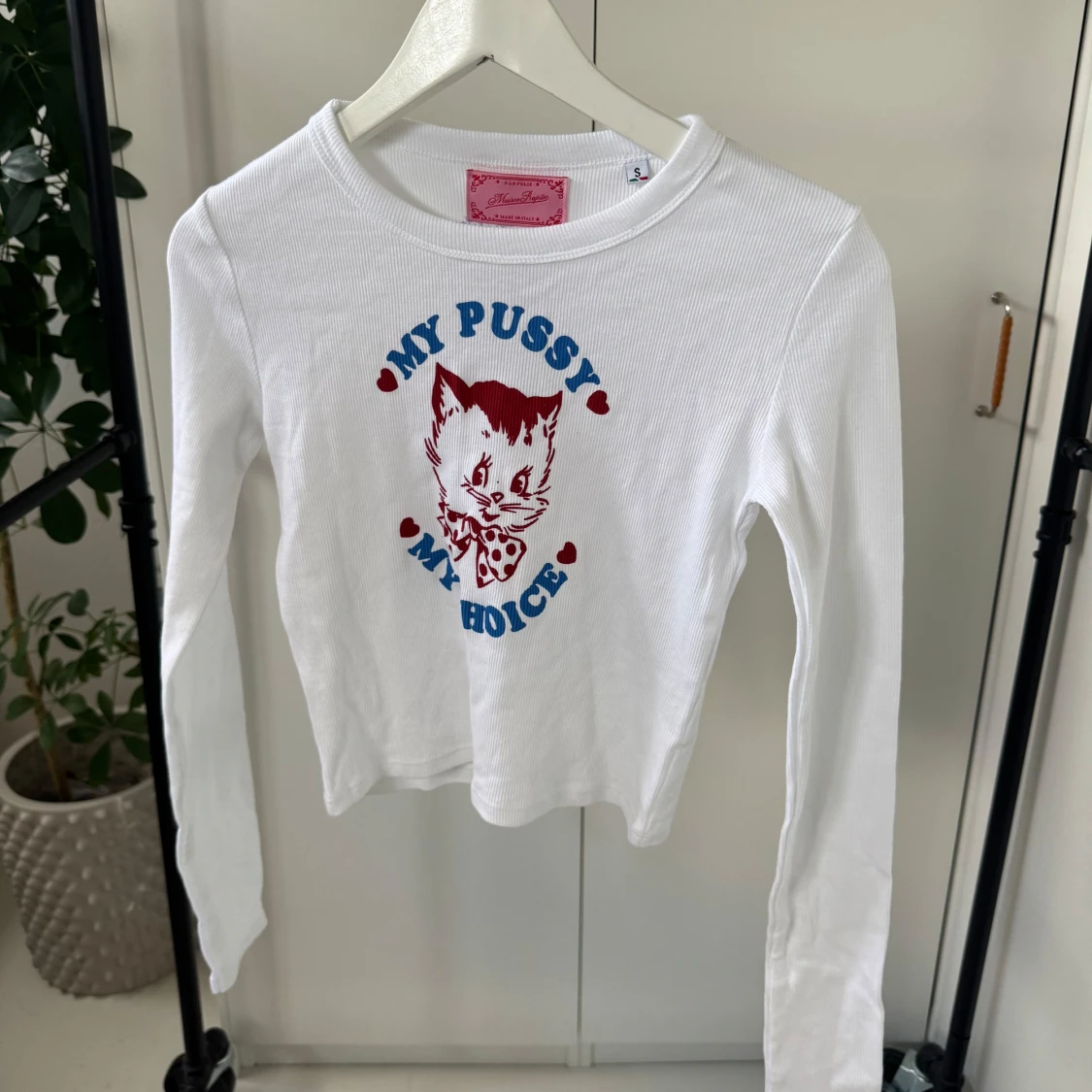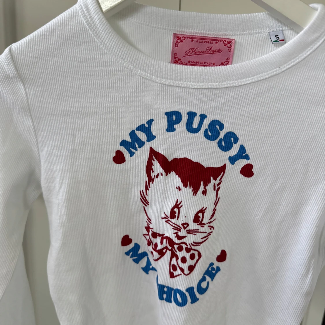 Säljer en vit ribbad tröja från Heart Club med ett kattmotiv och texten 'My Pussy My Choice' i blått och rött. Tröjan har långa ärmar och en rund halsringning. Perfekt för en statement-look!