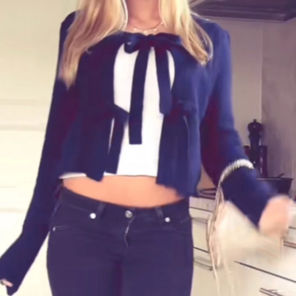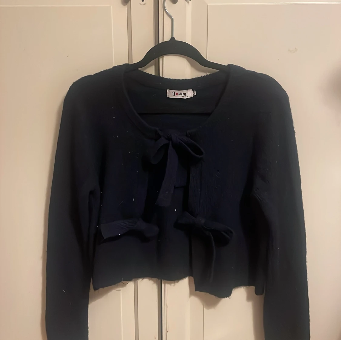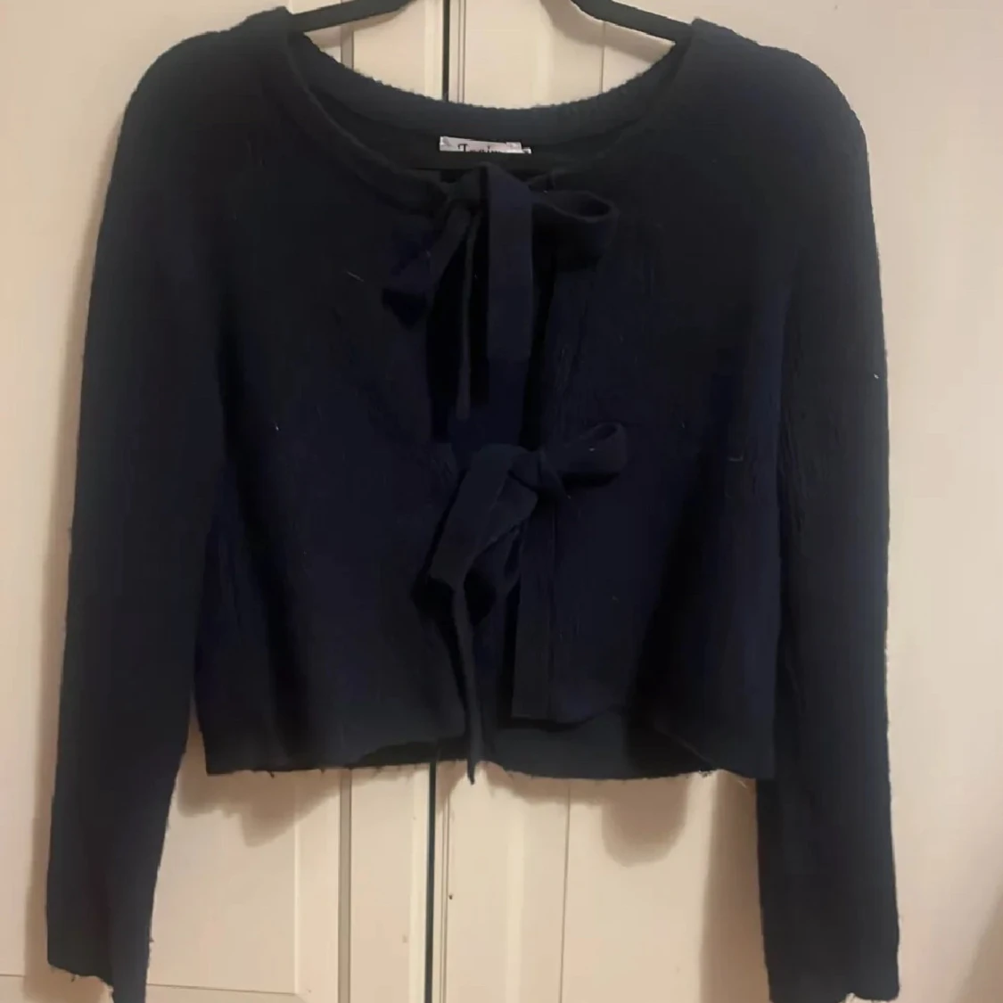 Supersöt mörkblå kofta med två knytband framtill. Croppad modell med långa ärmar och rund halsringning. Perfekt att slänga över ett linne eller topp för en trendig look. Mjuk och stickad känsla.