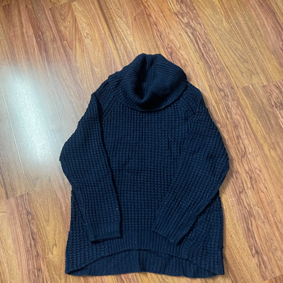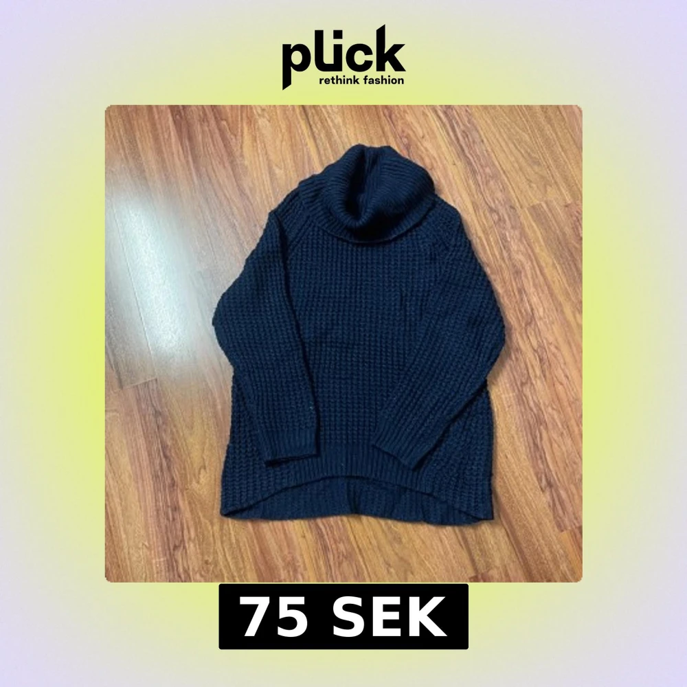 Mysig mörkblå stickad polotröja med grov struktur och hög, bred polokrage. Tröjan har lång ärm och något längre bakstycke för en chill look. Perfekt för kalla dagar när du vill vara både varm och snygg.