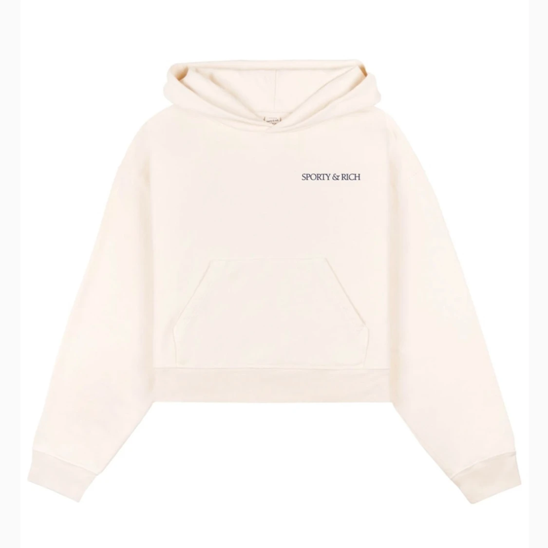 Säljer en kräm vit hoodie från Sporty & Rich som är använd en gång då den inte riktigt passade mig, den är såå fin men kan tyvär inte använda den:( nypris 2100kr