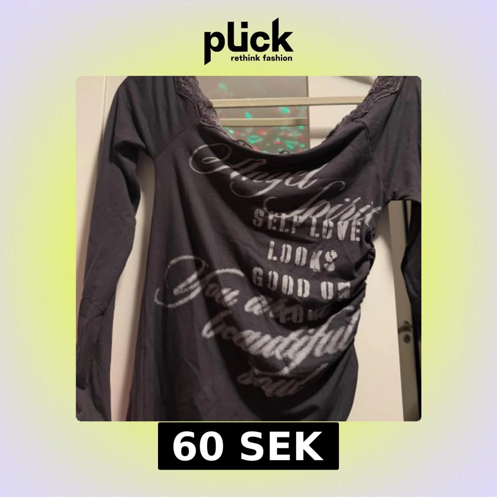 Grå långärmad topp med bred, rundad halsringning dekorerad med spets. Tryck i silverfärg med text över hela framsidan. Materialet känns mjukt och stretchigt, perfekt för dig som gillar statement-plagg med lite edge.